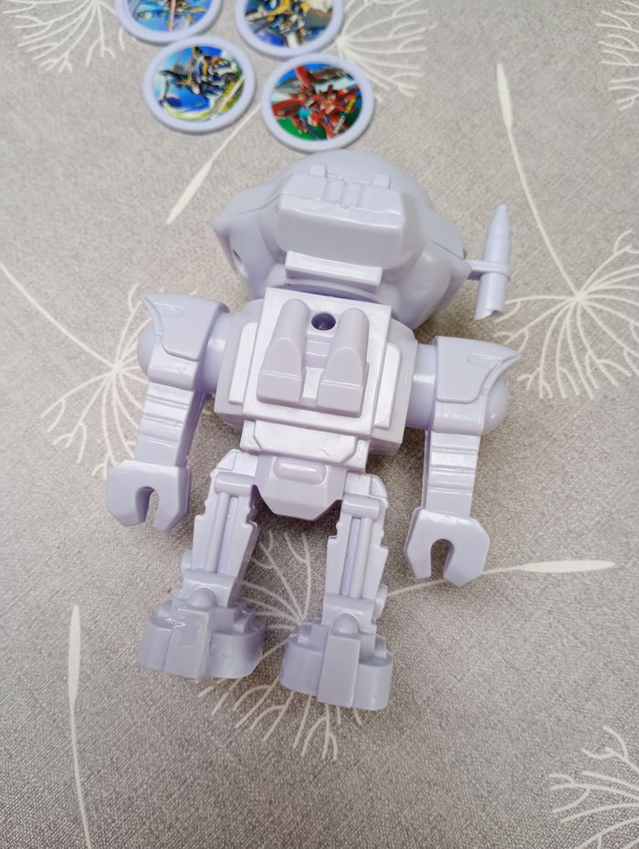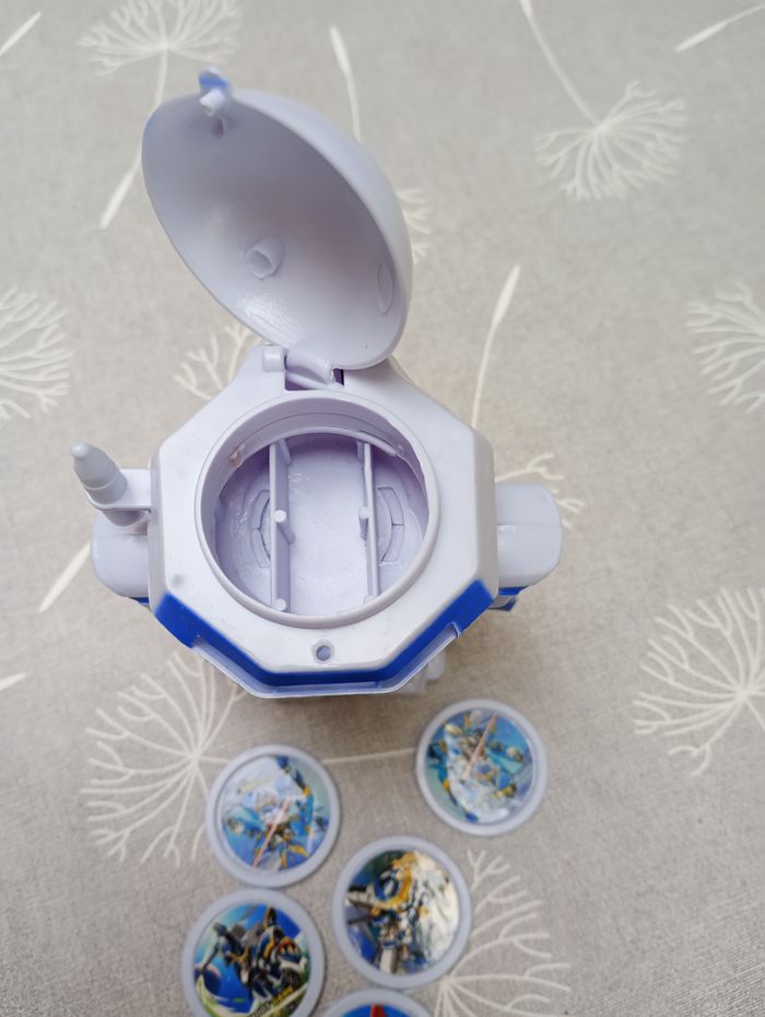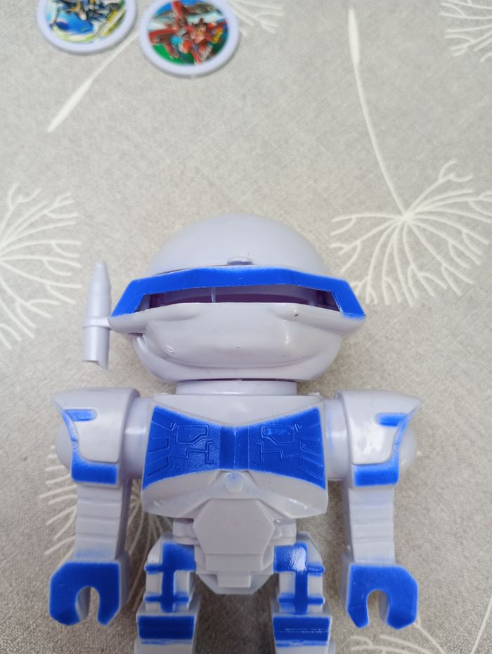 Petit robot de 12 cm de haut qui permet de lancer les disques à travers le casque grâce à la poignée sur le côté. Très bon état.
