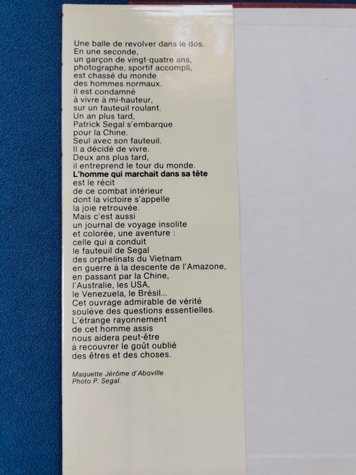 L'homme qui marchait dans sa tête Auteur : Patrick Segal Livre relié, couverture recouverte de toile protégée par une jaquette en papier glacé. Format 21,5 x 15,5 cm 8 pages de photos réparties dans l'ouvrage. J'adore tous les livres, rangement soigné. Lors de la lecture utilisation de marque-page. Pas de page cornée, ni d'annotations. A noter, pages un peu jaunies. #autobiographie #aventurehumaine #résilience #lhommequimarchaitdanssatete #patricksegal #franceloisirs #livrerelié #jaquette #illustrationphotos #mar-taylivre