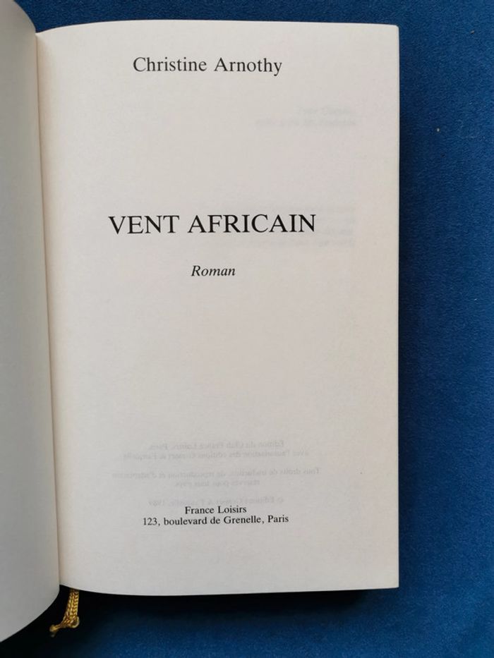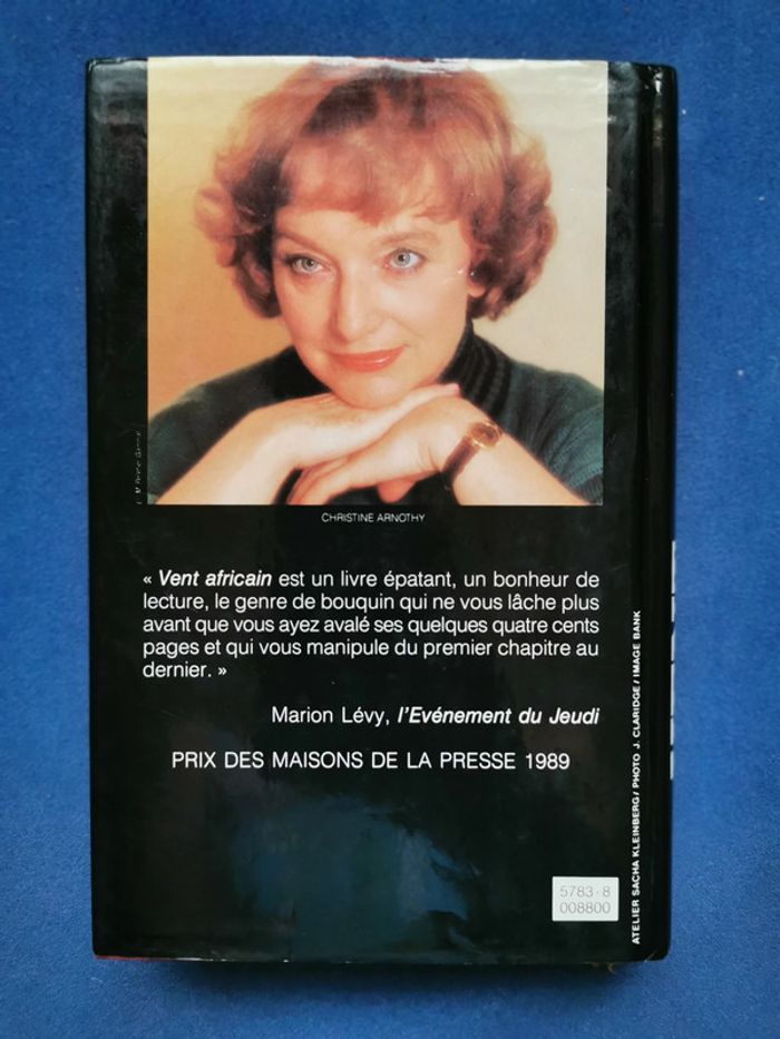 Vent africain Autrice : Christine Arnothy Editions Club France Loisirs Prix des Maisons de la Presse 1989 Livre relié, couverture recouverte de toile protégée par une jaquette en papier glacé. Ruban marque page En fin d'ouvrage un dossier illustré sur l'œuvre et l'autrice. Format 20,5 x 13,5 cm J'adore tous les livres, rangement soigné. Lors de la lecture utilisation de marque-page. Pas de page cornée, ni d'annotations. #roman #ventafricain #christinearnothy #franceloisirs #livrerelié #mar-taylivre