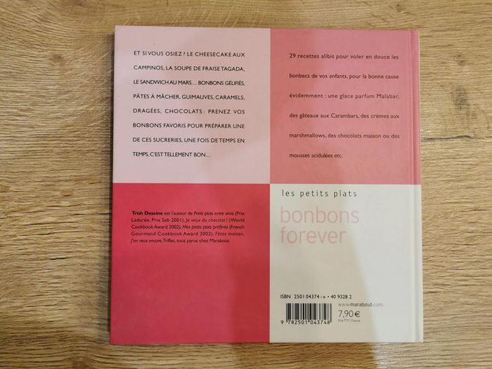 Bonbons forever Auteur : Trish Deseine Photographies : Deirdre Rooney Editions Marabout 29 recettes alibis pour voler en douce les bonbecs de vos enfants, pour la bonne cause évidemment : une glace parfum Malabar, des gâteaux aux Carambars, des crèmes aux marshmallows, des chocolats maison des mousses acidulées... Ingrédients, recette, illustration photo de chaque plat. 1 page de texte et 1 page photo par recette.... qui vous donne envie de toutes les tester ! Livre relié, couverture bien solide qui permet de bien faire tenir le livre sur un support. Format 20 x 20 cm Très peu utilisé, état comme neuf Prix d'achat 7.90€ #livredecuisine #recettesavecdesbonbons #bonbonsforever #marabout #mangergourmand #mar-taylivre #mar-taytable #mar-taymaison