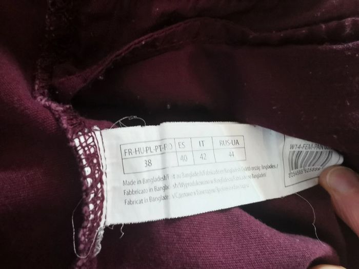 Pantalon slim bordeaux In extenso taille 38 Fermeture par bouton métal et zip Coupe style Jean 5 poches 2 poches repose main devant + 1 poche ticket 2 poches plaquées au dos. Passants pour ceinture 98% coton, 2% elasthane Mesures prises à plat : taille 39 cm, Longueur totale 97 cm, longueur entrejambe - ceinture : 22 cm, longueur entrejambe - base : 75 cm Peu porté reste en très bon état Couleur OK, mon tél déforme les couleurs des photos en gros plan. #jean #jeanbordeaux #jeanslim #pantalontslim #stretch #pantalonbordeaux #mar-tayfemme38 #mar-tayado