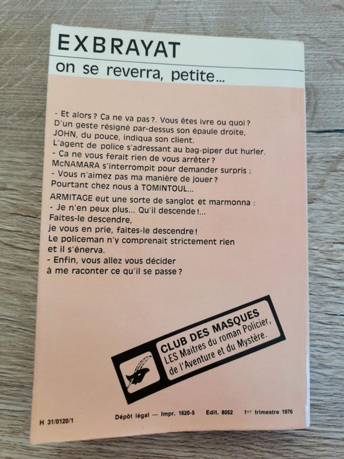 On se reverra, petite... Auteur : Exbrayat Club des Masques - LES Maîtres du roman Policier, de l'Aventure et du Mystère. Format poche 11 x 16.5 cm Très bon état, pas de pages cornées ni d'annotations #romanpolicier #polar #Clubdesmasques #exbrayat #livredepoche #mar-taylivres