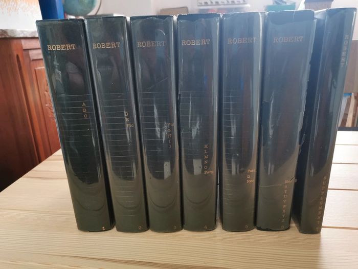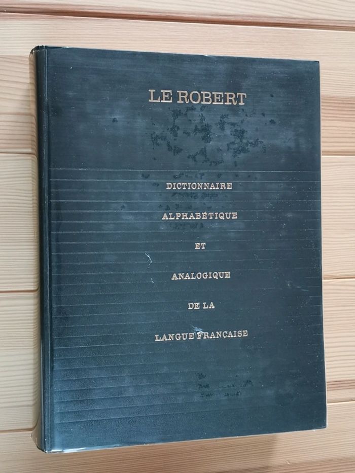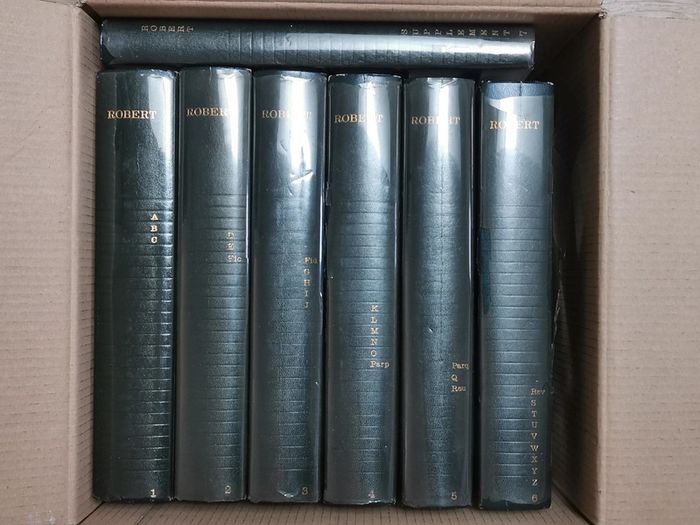 Dictionnaire alphabétique et analogique de la langue française. Le Robert 6 volumes pour couvrir tout l'alphabet + 1 volume de supplément paru ultérieurement pour complément et mise à jour. Particularité de l'approche du Robert : classement alphabétique pour permettre une recherche facile, permet également au delà des mots de la même famille de retrouver les mots dont le sens est approchant ou opposé. Approche plus littéraire que le Larousse, par exemple. On retrouve : prononciation phonétique, étymologie, différents sens du terme assortis de plusieurs exemples, emplois tirés de la littérature, synonymes et antonymes. Très bon état global. Quelques marques d'usage sur les couvertures, pages intérieures en état impeccable. #dictionnaire #dictionnairerobert #dictionnaire7volumes #referencelitteraire #lerobert #mar-taylivre
