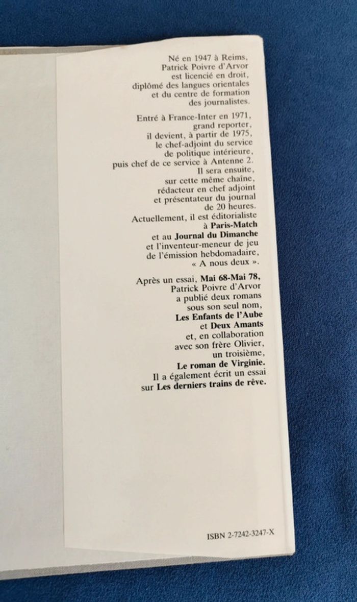 La traversée du miroir Auteur : Patrick Poivre d'Arvor Livre relié, couverture recouverte de toile gris clair avec impressions dorées, protégée par une jaquette en papier glacé. Ruban marque page doré. J'adore tous les livres, rangement soigné. Lors de la lecture utilisation de marque-page. Pas de page cornée, ni d'annotations. #roman #société #mar-taylivre