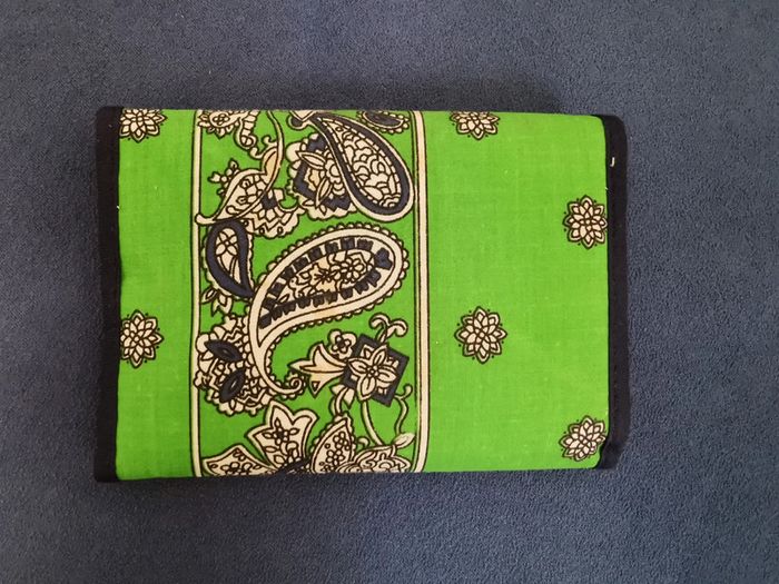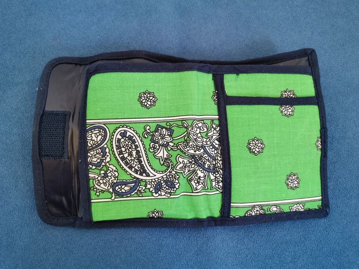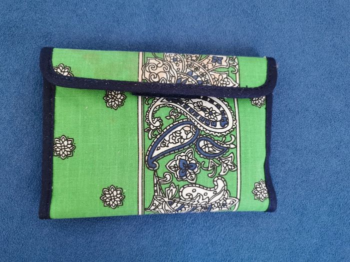 Portefeuille composé d'une poche plaquée ouverte sur un côté et d'une petite poche plaquée format carte bancaire. Le tout se replie en 2 et se ferme par un scratch. Fond vert vif, motifs cachemire banc et marine. Utilisé reste en bon état, quelques traces brunes (cf. photo) Dim totales : 20.5 x 12.5 cm Dim replié : 9 x 12.5 cm #portefeuille #portemonnaie #portecarte #accessoire #mar-tayaccessoires