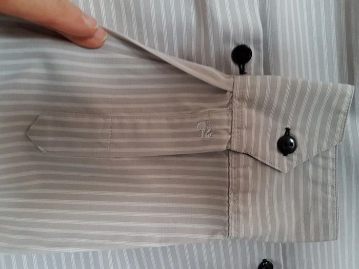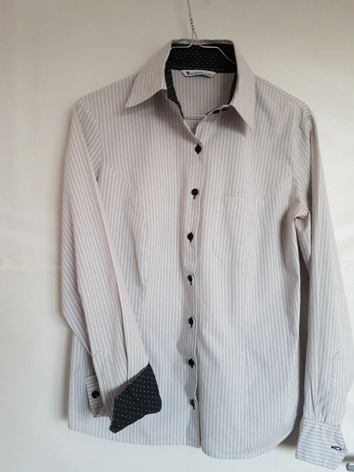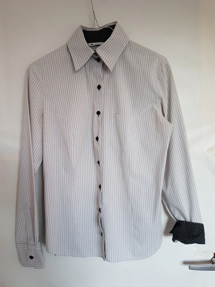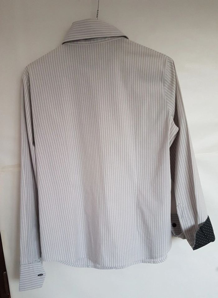 Chemise réalisée sur mesure. Correspond à un 38. Choix des assemblages de tissus et des coupes ( corps, col, poignets), donne donc un modèle "unique" (sauf si quelqu'un a fait exactement les mêmes choix... 😉). Finitions très soignées. Broderie de la marque au poignet. Très peu portée, état impeccable. Vous pouvez me demander des mesures si vous souhaitez, n'hésitez pas ! #chemisesurmesure #chemisetailleur #rayures #grisperle #poisblancs #chemiseclasse #chemiseluxe #bivolino #mar-tayfemme38