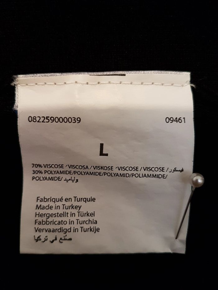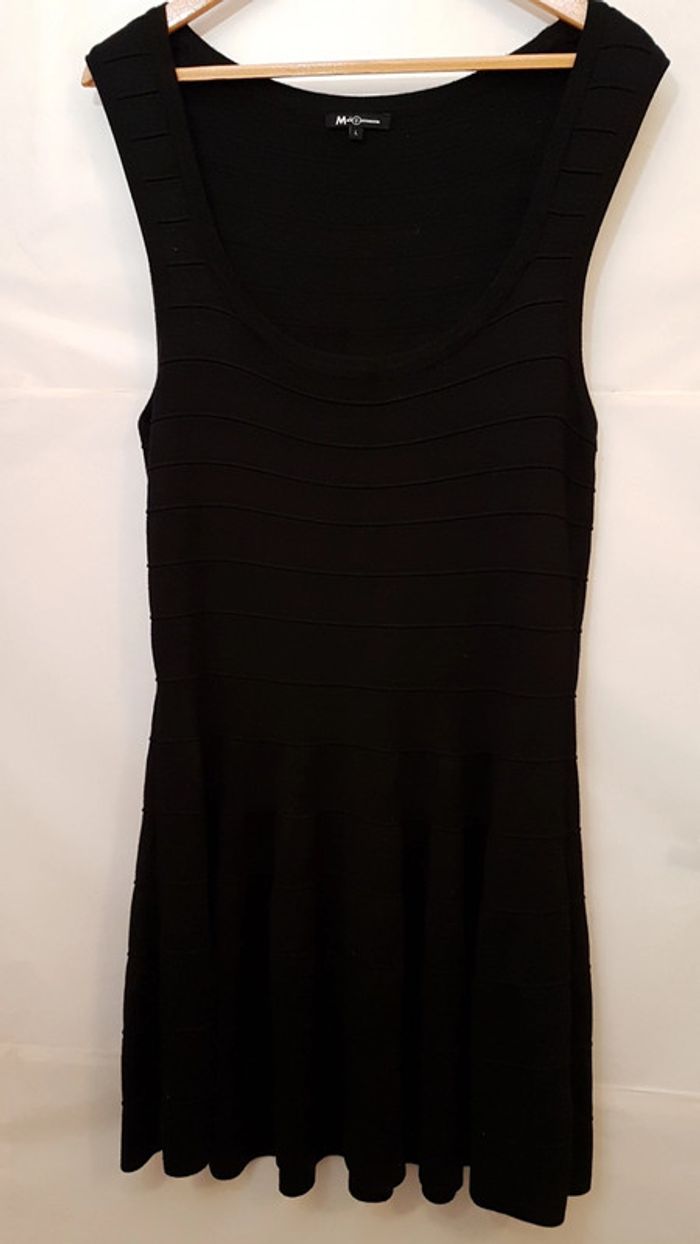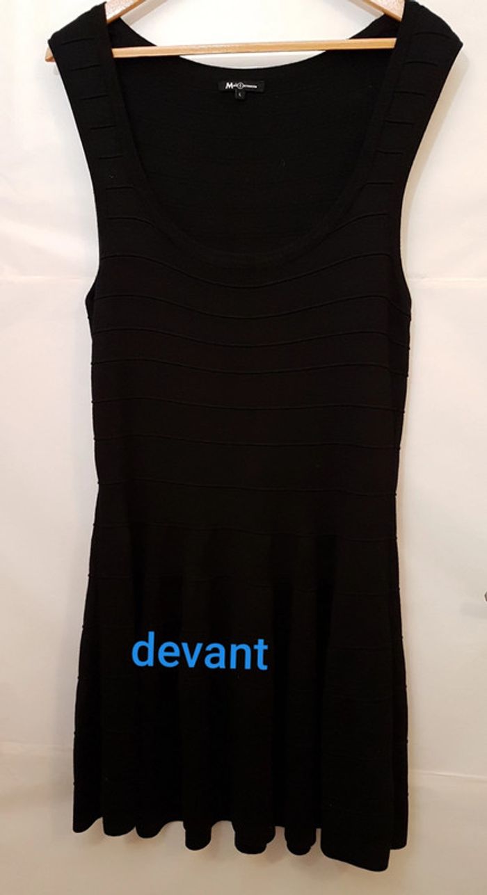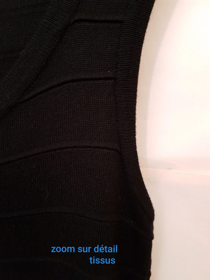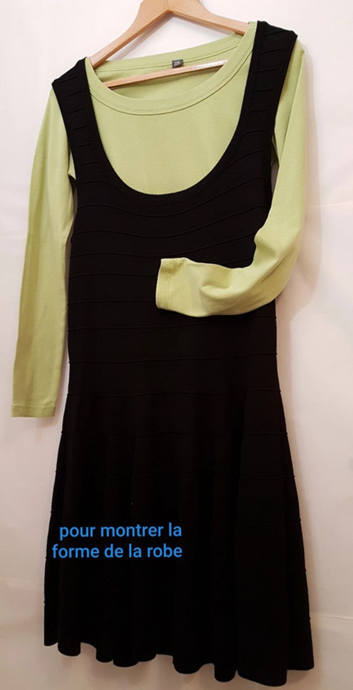 Robe chasuble bien échancrée devant, rythmée par nervures horizontales. Beau tombé, le bas forme des godets. La maille du tissu le rend extensible. Peu portée, état impeccable. Longueur dos : 93 cm La photo avec le tee-shirt vert est juste un exemple qui permet de bien voir la forme. #robechasuble #robenoire #robesansmanche #robemilongue #mar-tayfemme40