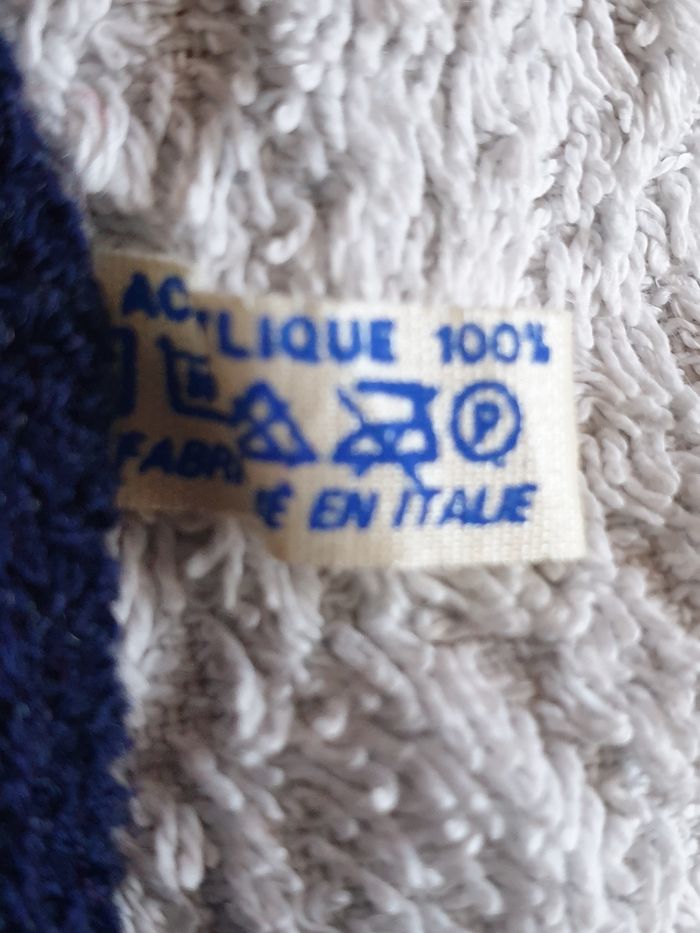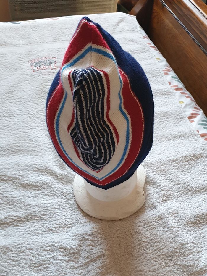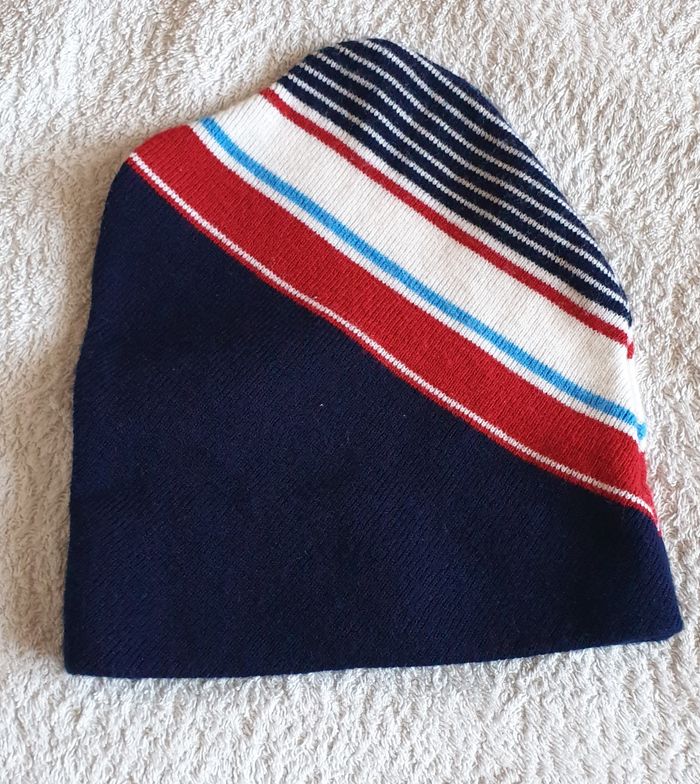 Bonnet adulte, bleu marine, avec rayures bleues, blanches et rouges. Taille non mentionnée. 100 % acrylique Tour de tête : 53 cm Hauteur : 25 cm Envoi rapide et soigné
