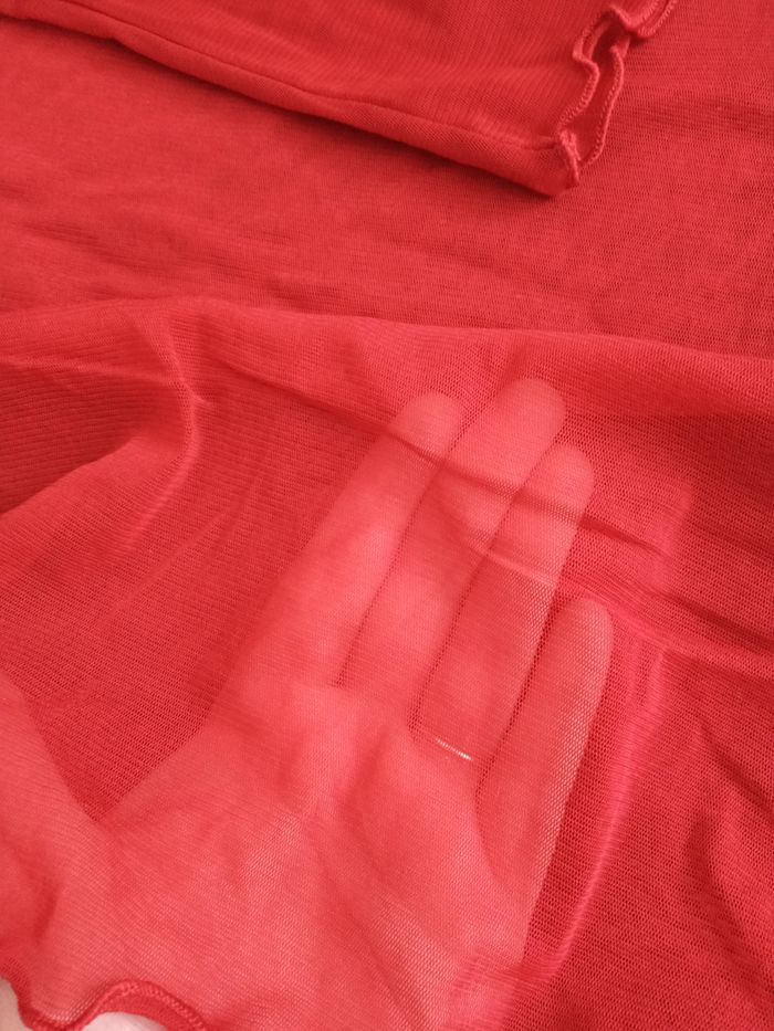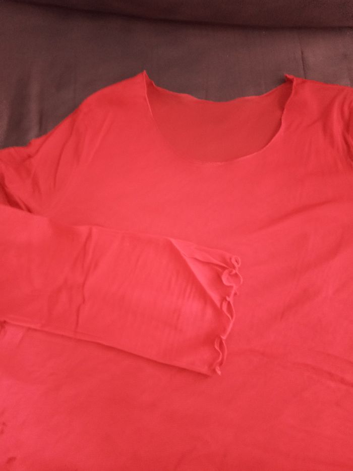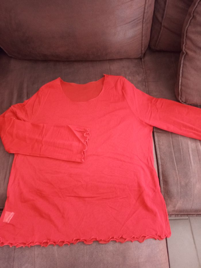 Joli petit Haut Taille 48 Couleur: Rouge uni transparent (le rouge est un peu plus foncé que sur la photo) Manches longues Entièrement transparent Se porte près du corps Dimensions: Longueur 55cm - aisselles à aisselles 50cm - épaule à épaule 37cm - Longueur des Manches 58,5cm Matière: 100% Polyester (extensible) Haut comme Neuf, porté 1 fois (vendu comme sur les photos)