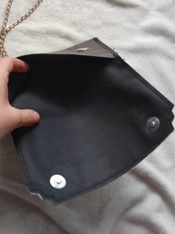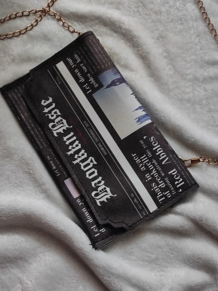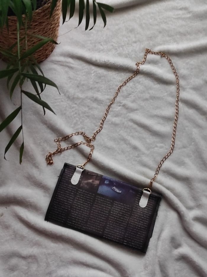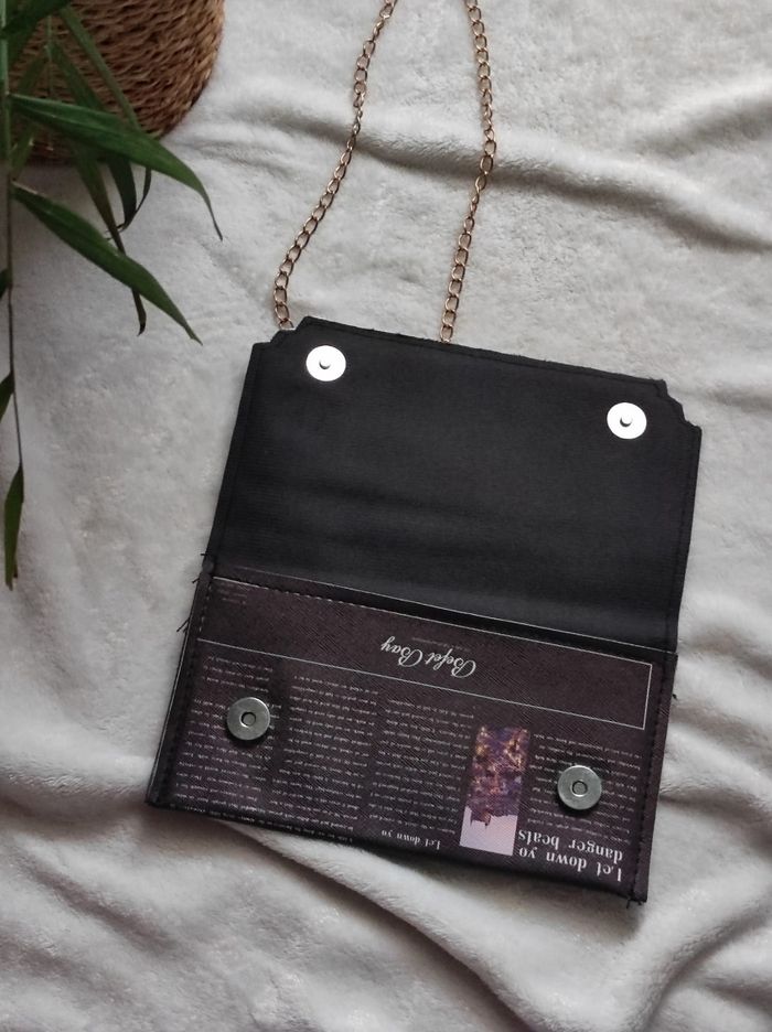 petit sac à main noire à motif d'un journal avec chainette doré qui peut-être retirer pour en faire une pochette, intérieur doublé et fermeture boutons aimanté. En très bon état, dimensions 21,5x11,5 cm.