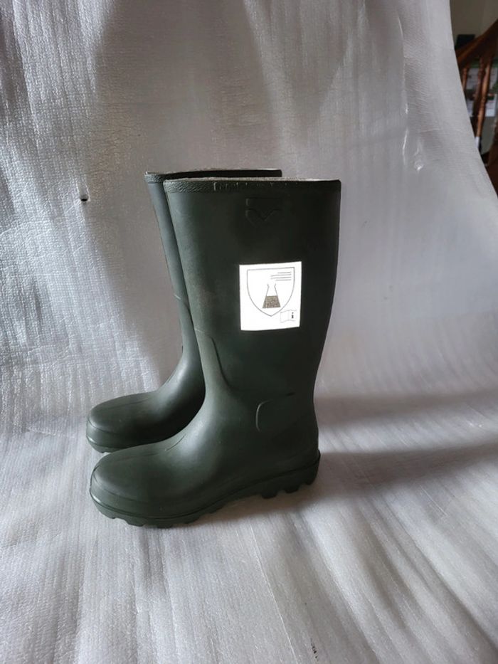 Bottes de sécurité avec semelle anti perforation taille 36 Excellente résistance aux produits chimiques : hydrocarbures, huiles, graisses, solvants, acides faibles et dilués, produits phytosanitaires. Excellente résistance à l'abrasion, aux coupures Absorption d'énergie du talon. Antistatique Résistance à la chaleur de contact (HRO) Résistance à la coupure (CR Protection des malléoles hautement résistantes aux produits chimiques : Solution d'hydroxyde de sodium (K) Solution ammoniacale (O) Peroxyde d'hydrogène (P) Résistance au glissement de la semelle (SRC) : Sur sol acier. Sur sol céramique. Pour les pointures 36 et 37/38 les embouts et semelles anti-perforation sont en acier. Achetées 113 euros Plus de choix sur #chaussuressolene29690