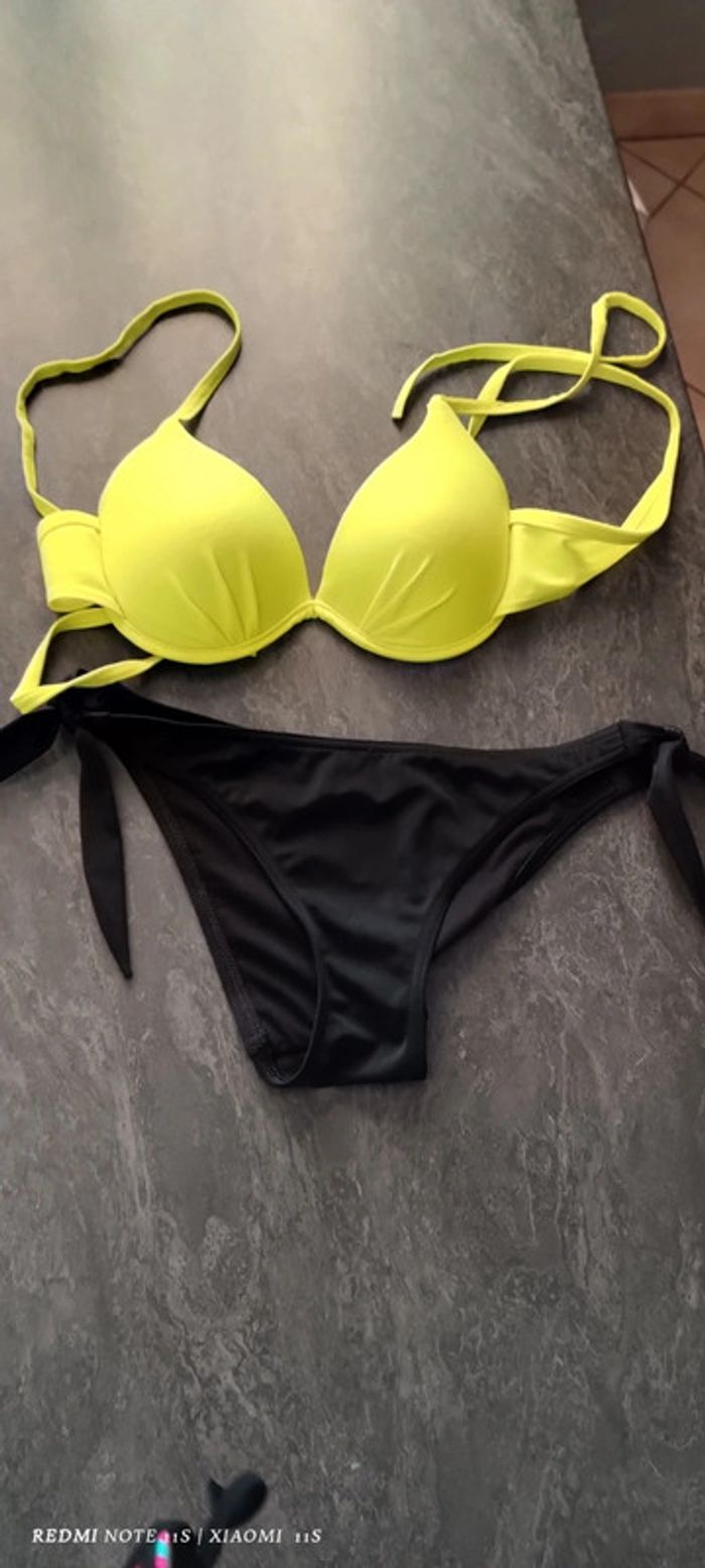 Jamais porté, culotte noir et soutien gorge jaune