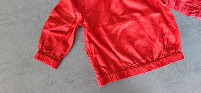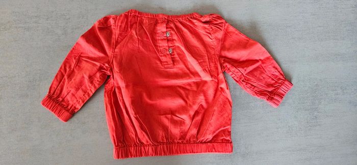 Jolie blouse rouge en très bon état avec un petit nœud sur le côté du cou. Élastique a la taille et aux poignets. Tape à l'œil taille 6 mois A4
