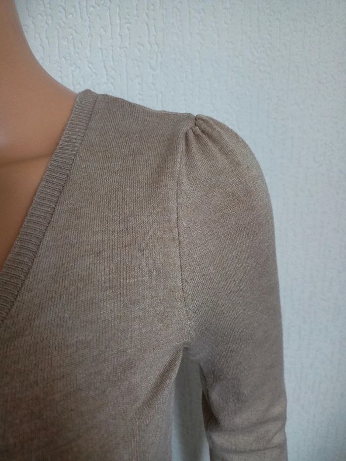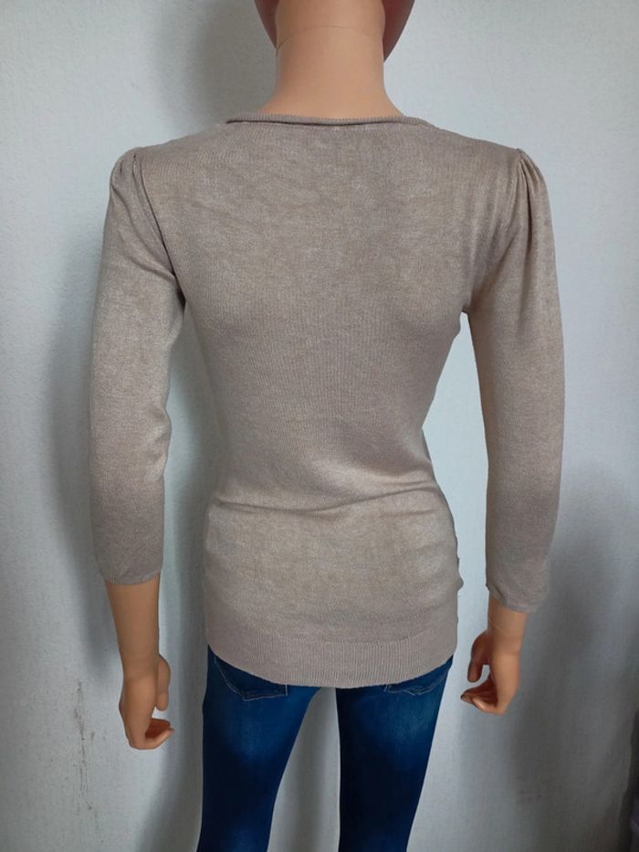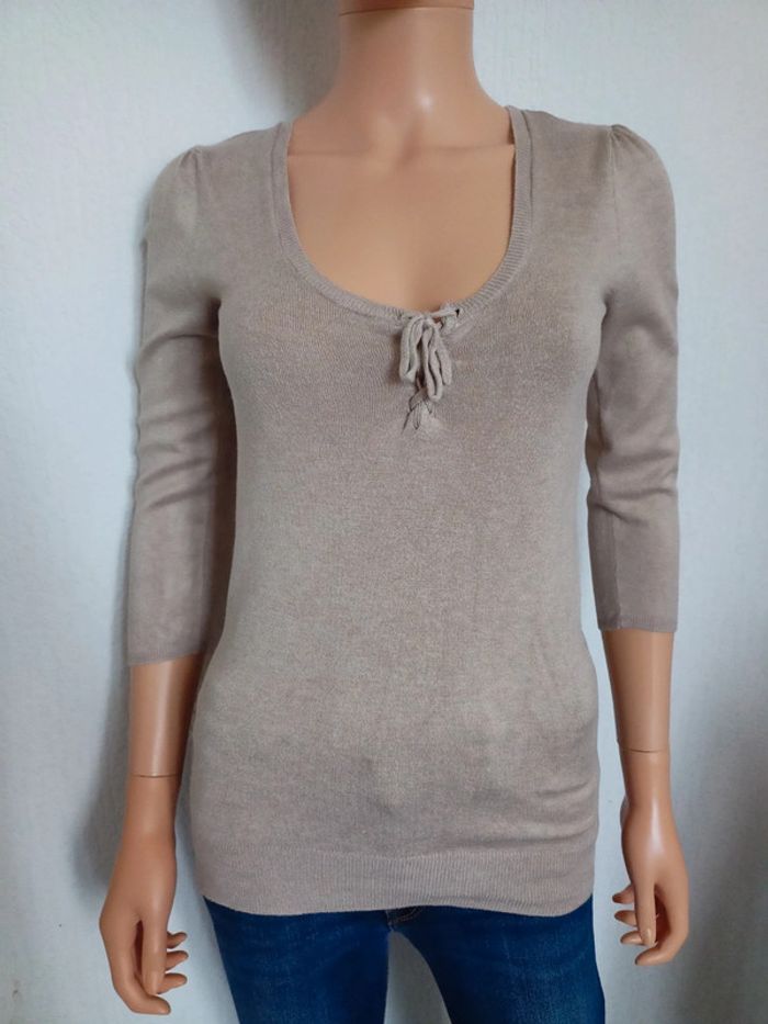 Pull col rond avec laçages à la poitrine, de couleur taupe. En bon état car possède de légères bouloches peu visibles. Plus d'étiquettes. De taille S. Se porte près du corps. Toucher doux.