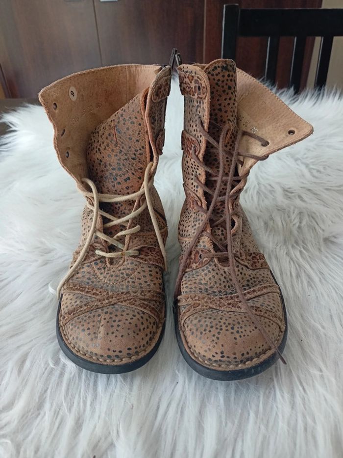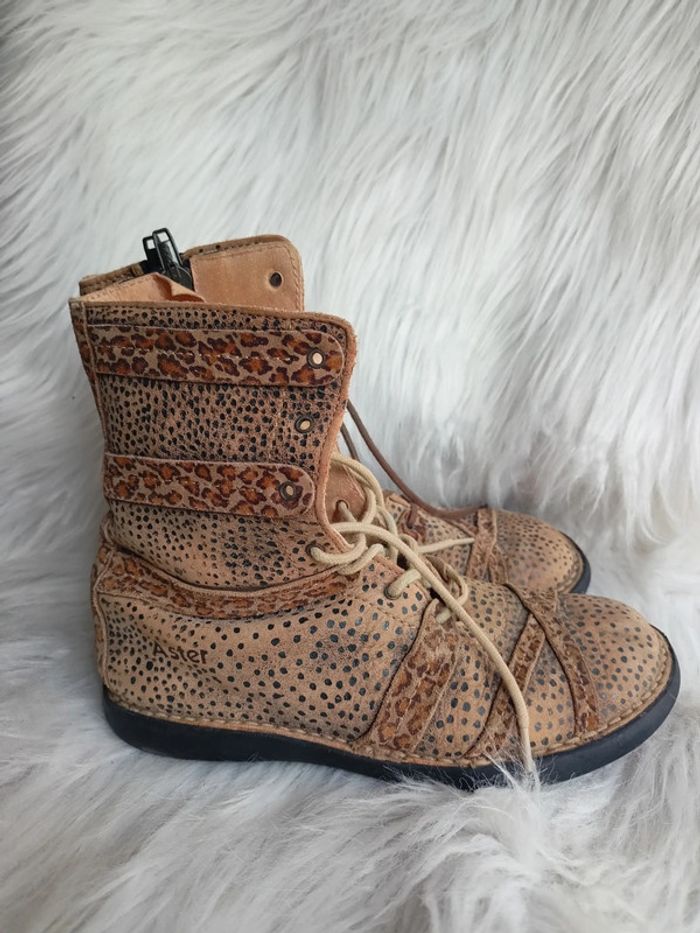 Bottines montantes aux motifs léopards, de couleur marron, de Pointure 32. Marque Aster , en bon état car bout de pied un peu frottés et formés, semelles un peu usées. Il faudra changer les lacets car ils sont de différentes tailles et couleurs. SHO*042