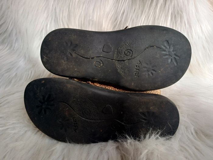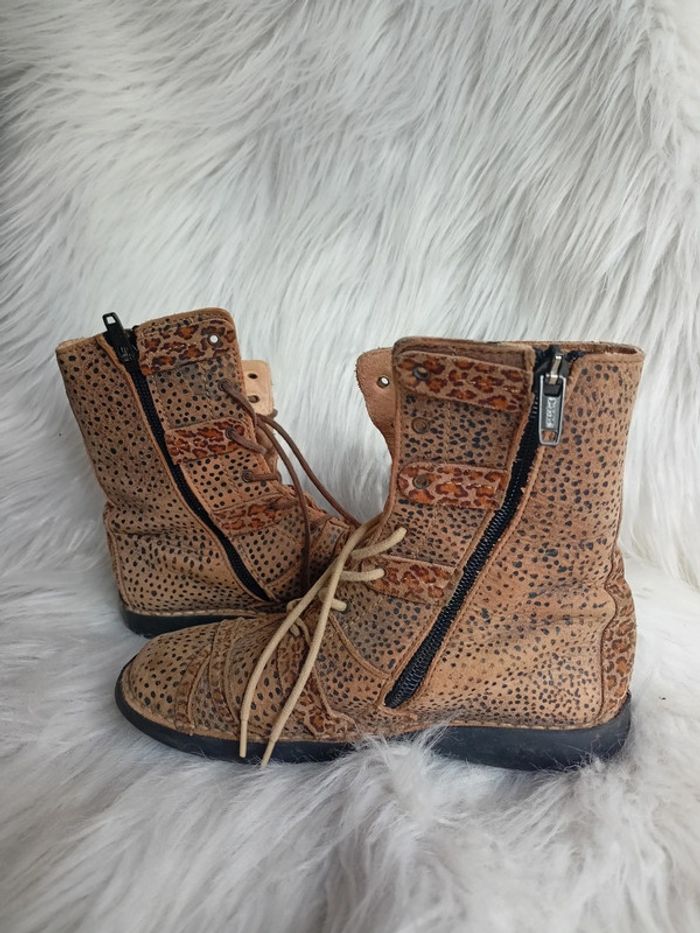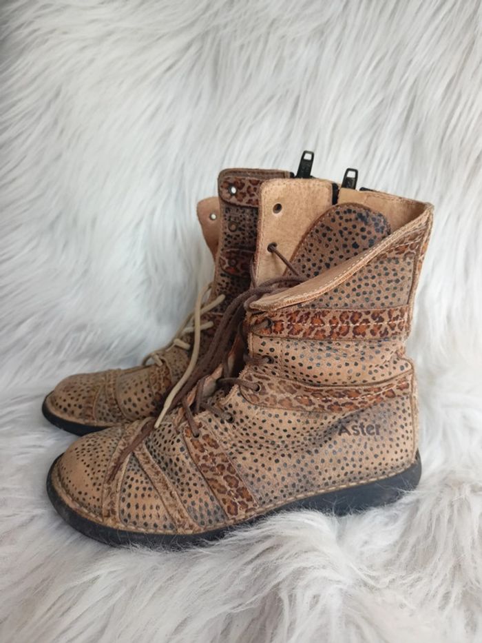 Bottines montantes aux motifs léopards, de couleur marron, de Pointure 32. Marque Aster , en bon état car bout de pied un peu frottés et formés, semelles un peu usées. Il faudra changer les lacets car ils sont de différentes tailles et couleurs. SHO*042 #marynline78Chaussuresp32