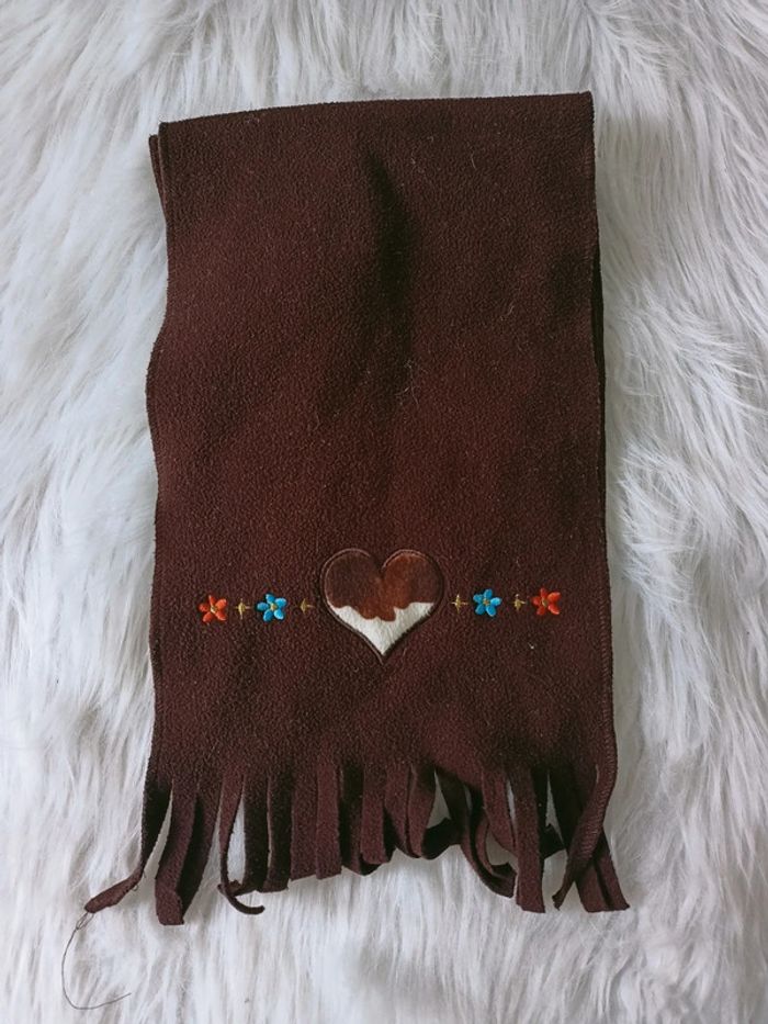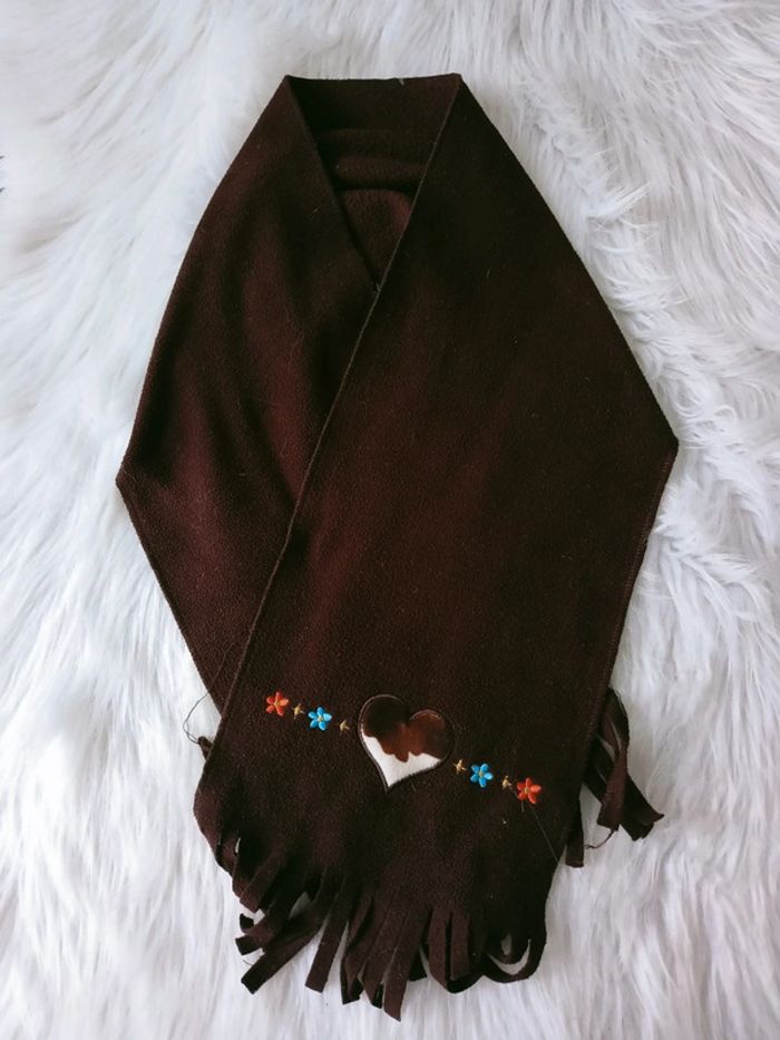 Écharpe polaire marron avec petit cœur en fausse fourrure. Elle fait environ 1m20 avec les franges et 20cm de large. Pas de marque , pas d'étiquette. En très bon état.