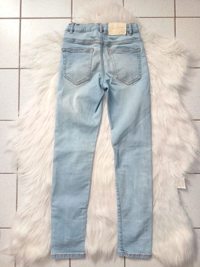 Jean de coupe skinny, de couleur bleu ciel bleached, taille 9 ans (134cm). Marque Zara. Élastiques à la taille, destroy sur une jambe. En 98% coton et 2% élasthanne. En bon état car trace de feutre sur le fessier, et un peu éraflé sur l'arrière : tout est en photo. N*0524. #marynline78enfant #marynline78garcon9ans
