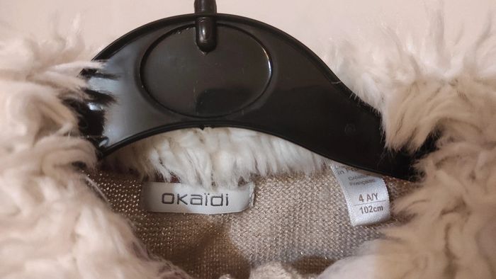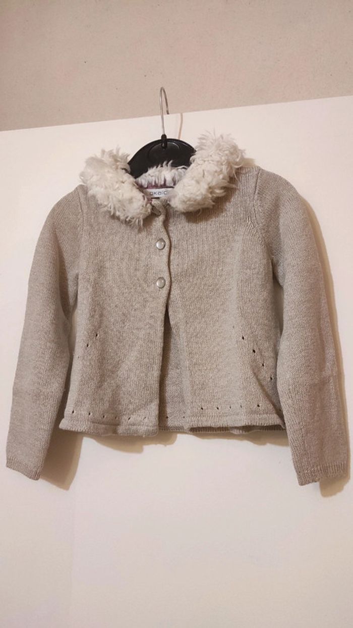 Gilet beige pailleté pour un effet scintillant Marque Okaïdi, taille indiquée 4 ans mais très petit convient plutôt à 2-3 ans Avec de la moumoute au col Chic et hivernal