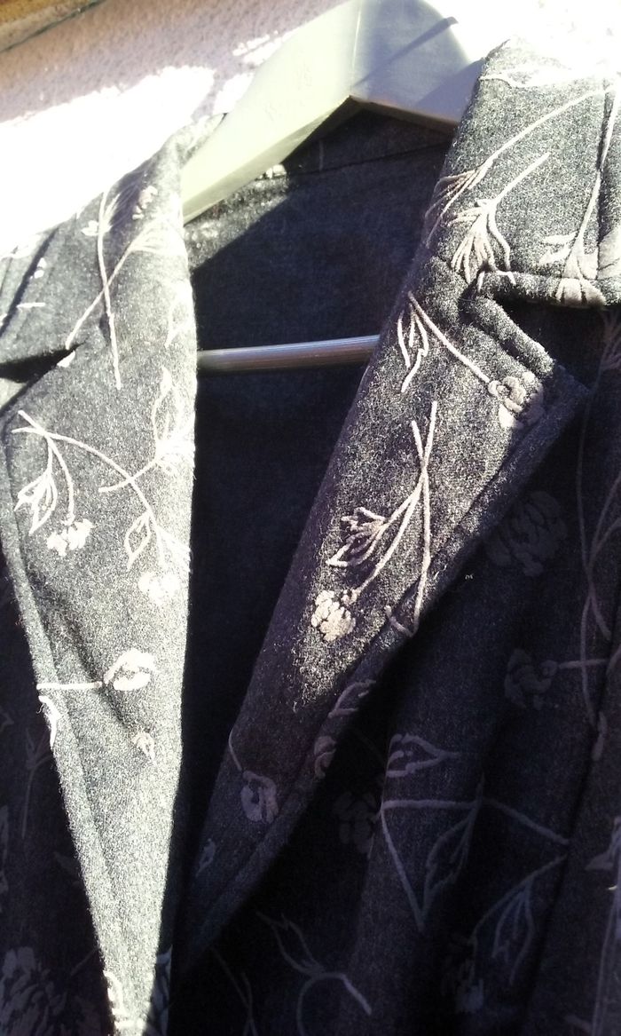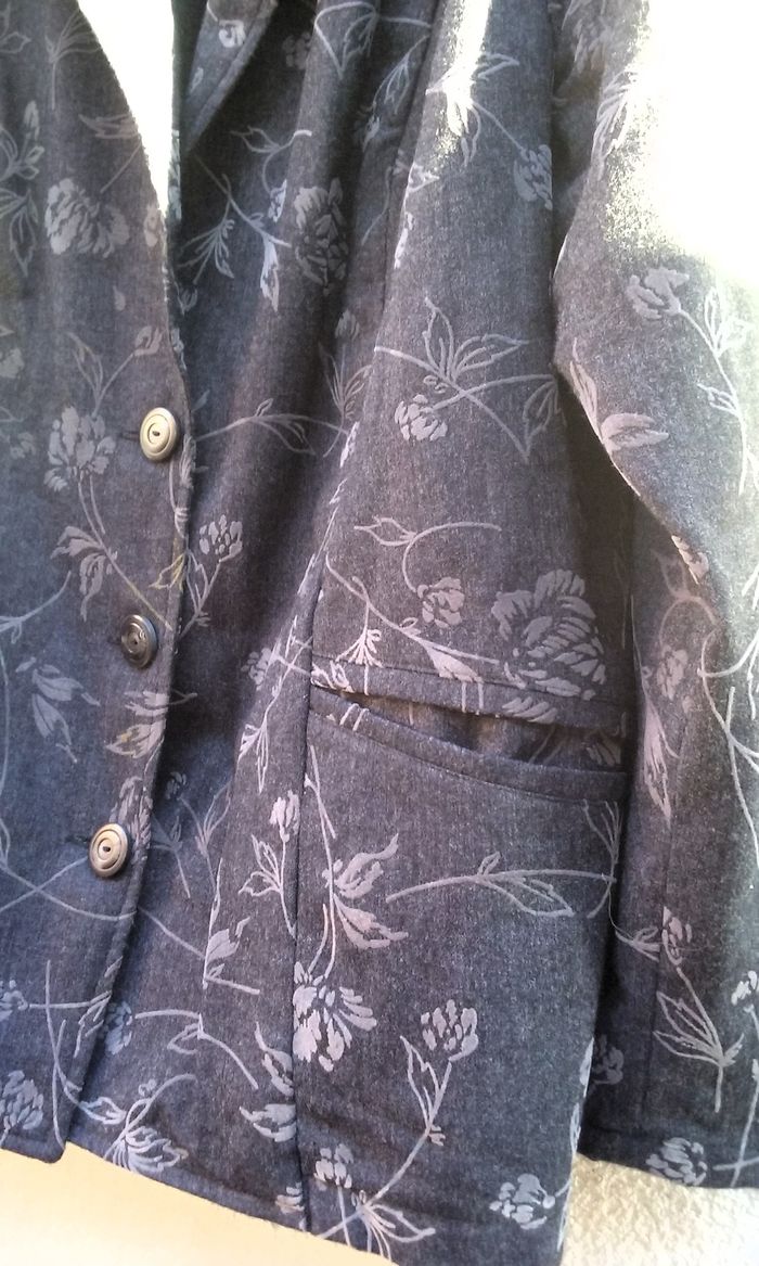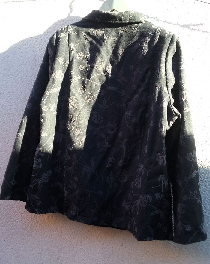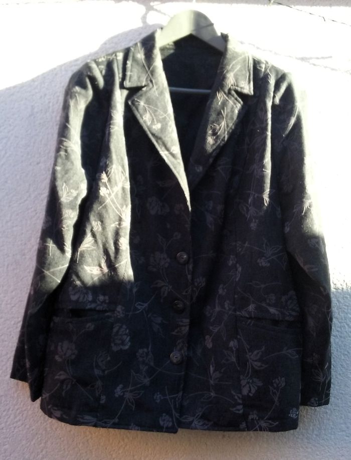 Coloris gris anthracique avec motifs fleurs légèrement en surimpression velours, 2 poches, épaulettes (possibilité de les enlever), T42/44.