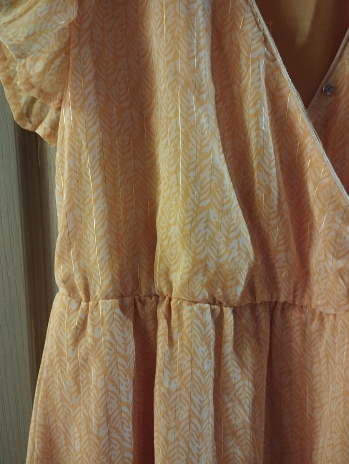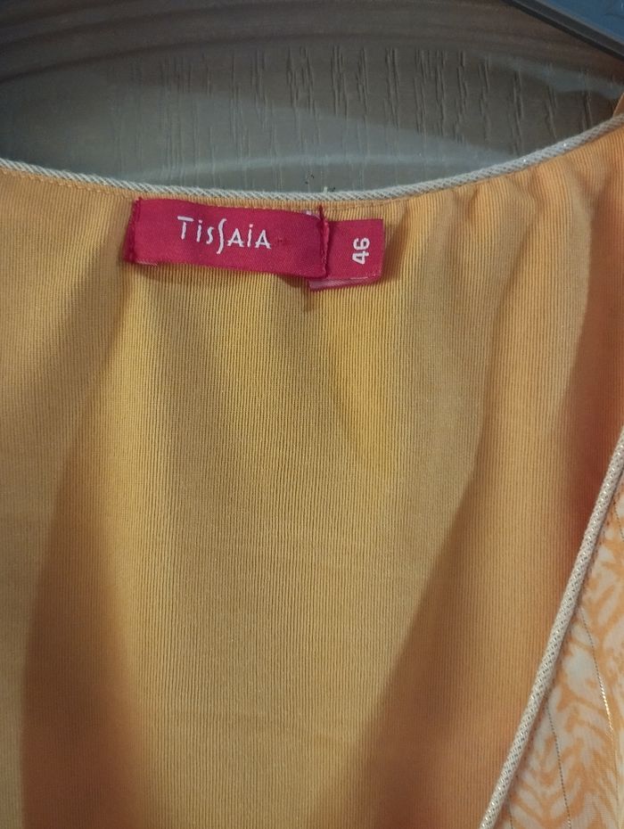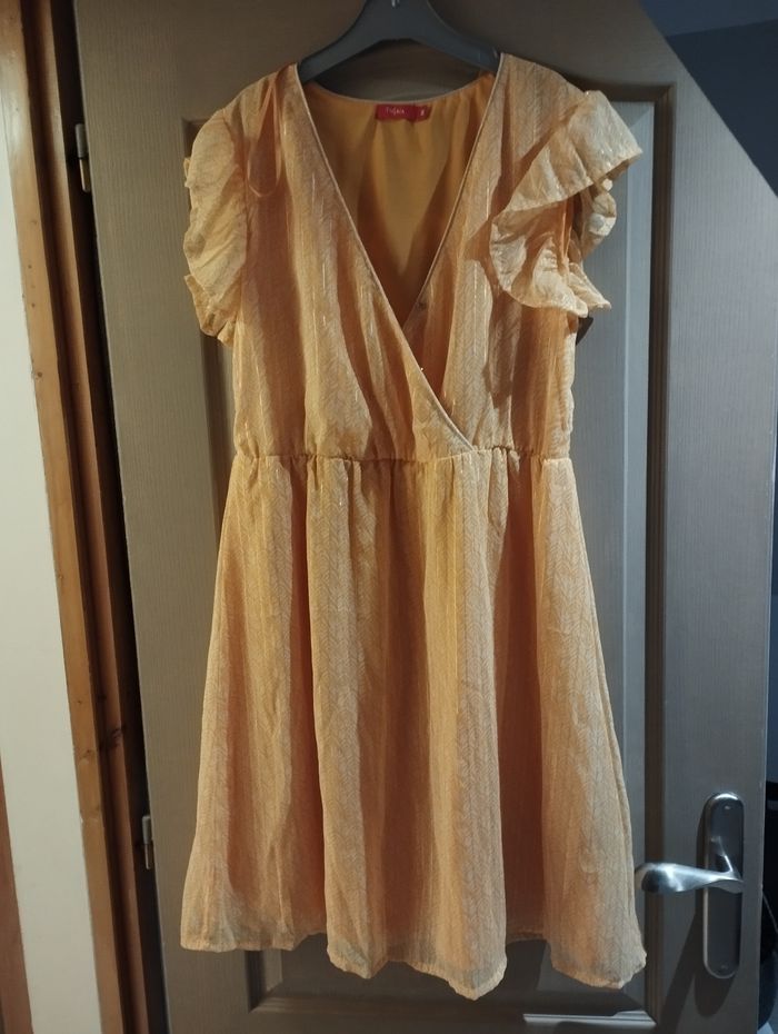 Robe taille 46 ,jaune jamais portée avec liseré doré très légère.