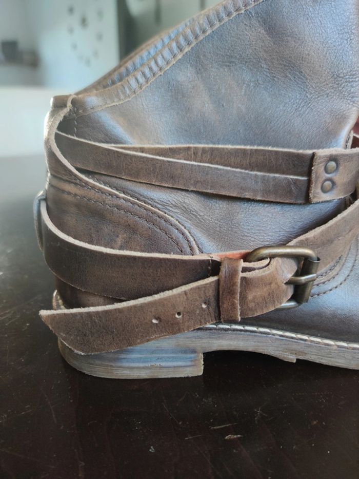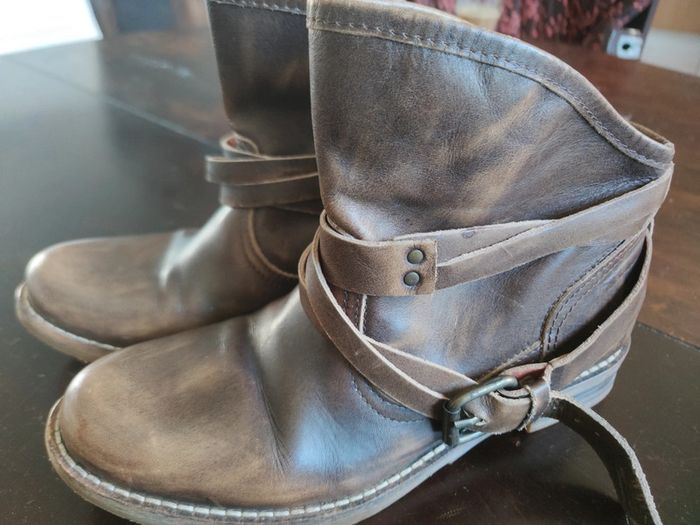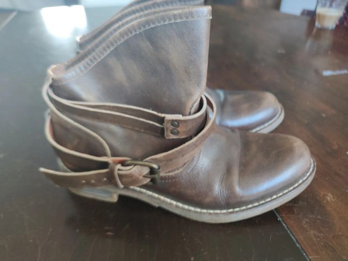 Belles boots/bottines marron clair en cuir, avec lanières et boucle. Marque Invito. Pointure 36 qui correspond à du 35. Non portées car trop petites pour moi (je fais du 36). Talon 2 cm. Réduction sur les lots