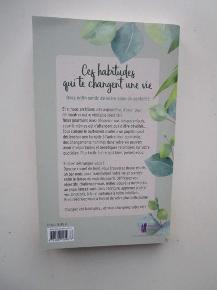 Osez enfin sortir de votre zone de confort ! Et si nous arrêtions, dès aujourd'hui, d'avoir peur de montrer notre véritable identité ? Nous pourrions ainsi découvrir nos trésors enfouis, ceux-là mêmes qui n'attendent que d'être dévoilés... Tout comme le battement d'ailes d'un papillon peut déclencher une tornade à l'autre bout du monde, des changements minimes dans votre vie peuvent avoir d'importantes et bénéfiques retombées sur votre quotidien. Plus facile à dire qu'à faire, pensez-vous. Eh bien détrompez-vous ! Dans ce carnet de bord, vous trouverez douze rituels, un par mois, pour transformer votre vie et prendre enfin le temps de vous découvrir. Définissez vos objectifs, challengez-vous, initiez-vous à la méditation, au yoga, lancez-vous dans l'écriture, apprenez à gérer vos émotions, à faire confiance à votre intuition... Bref, réécrivez-vous à l'encre de votre plus belle plume. Changez vos habitudes... et vous changerez votre vie ! Éditeur ‏ : ‎ AMETHYSTE 142 pages Dimensions ‏ : ‎ 11.2 x 1.2 x 18 cm Livre en excellent état Je vends d'autres livres feelgood #phil_peg_feelgood #zonedeconfort #feelgoog #changement #habitudes #rituels #développementpersonnel