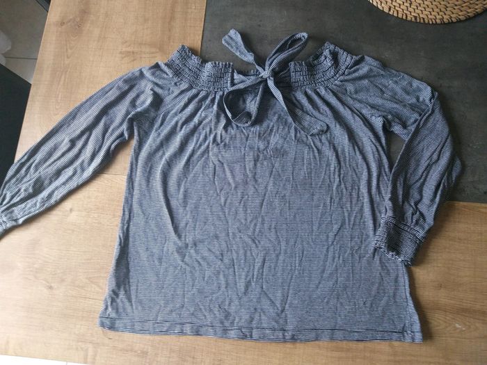 Portė rarement, très bon état, peut se porter baissé au niveau des épaules grâce au col élastique, détail nœud au dos, aux extrémités des manches élastiqué également, 100% coton