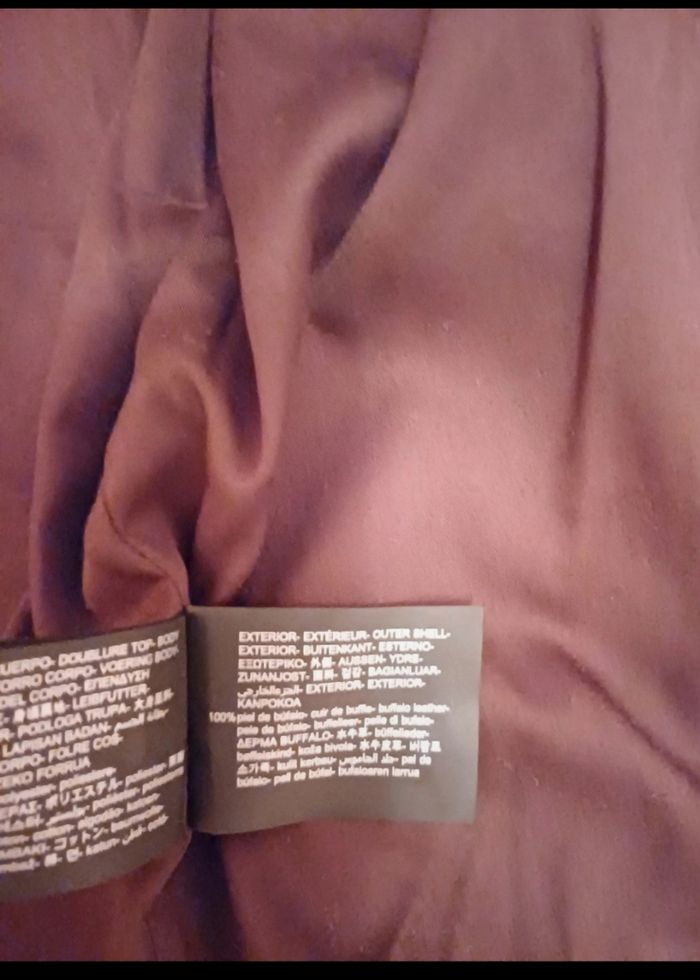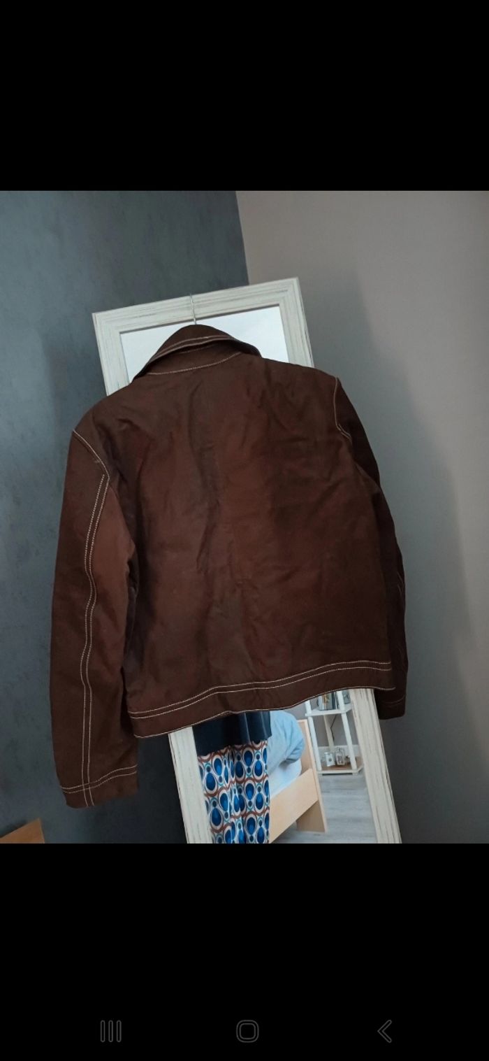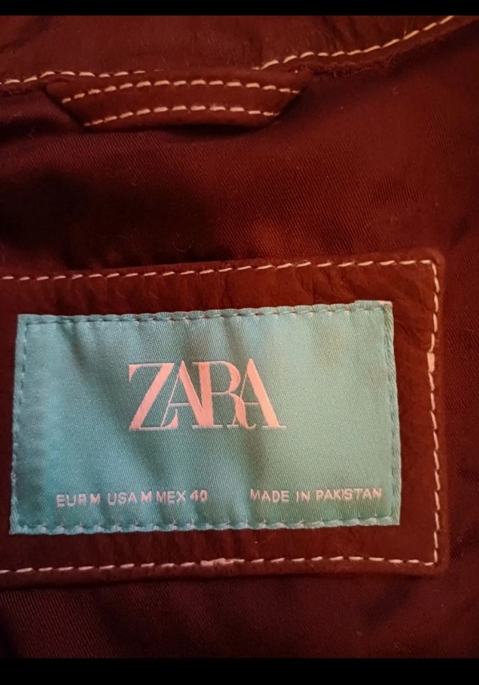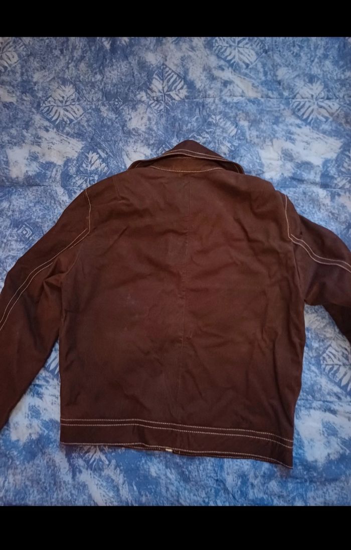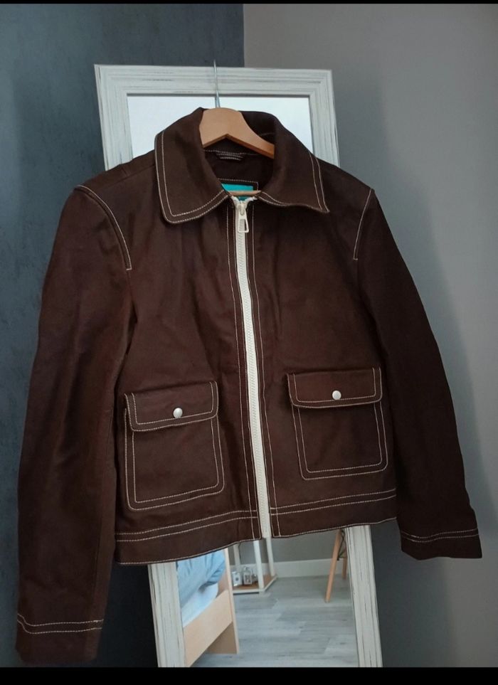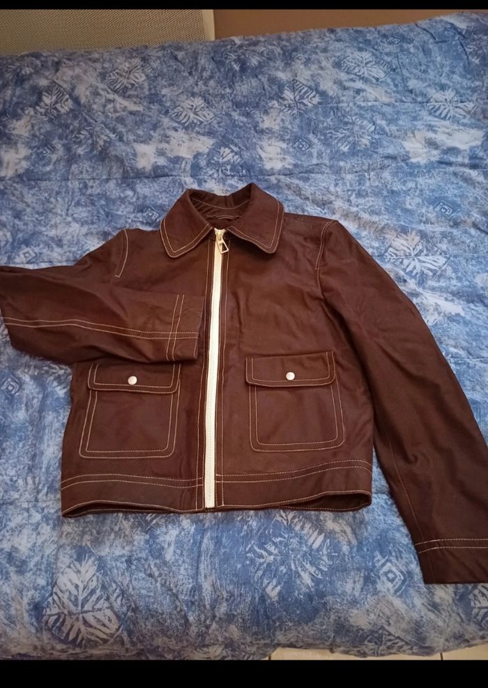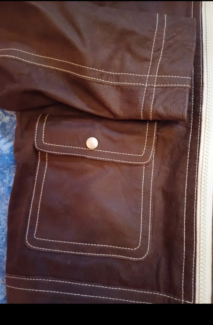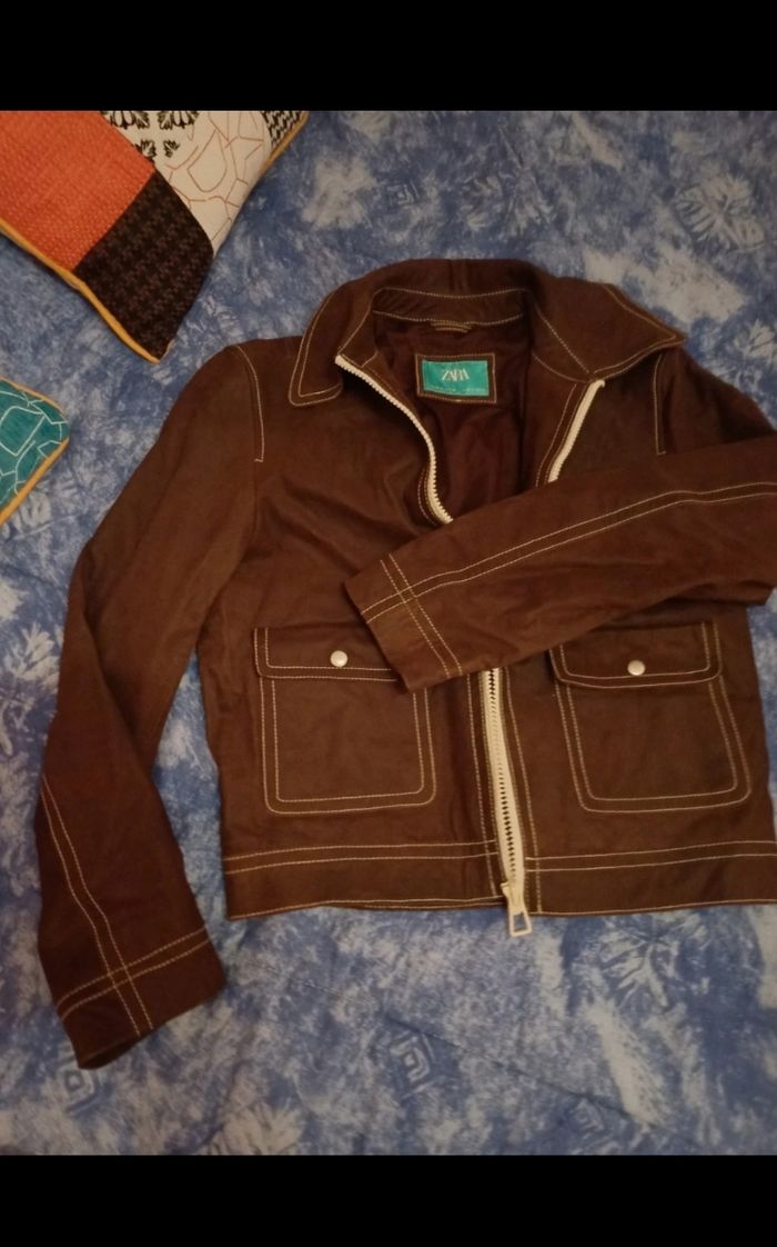 Très beau blouson de la marque Zara en cuir de buffle (on sent l'odeur du bon cuir). Façon vieux cuir. Taille M. Mon fils l'a juste essayé mais la taille ne lui correspond pas. Couleur marron, surpiqures blanches. 2 poches plaquées sur le devant se fermant par un bouton pression. En cuir de buffle. Acheté 180€