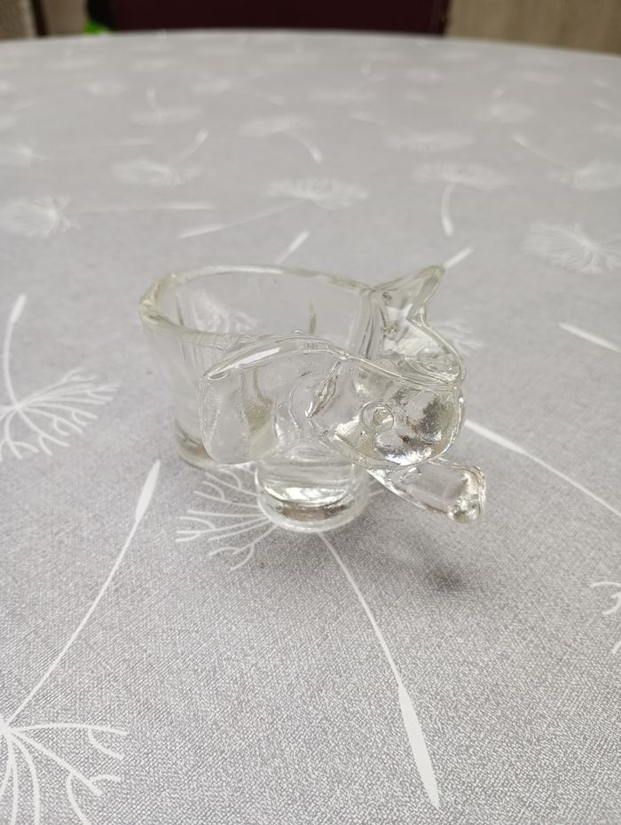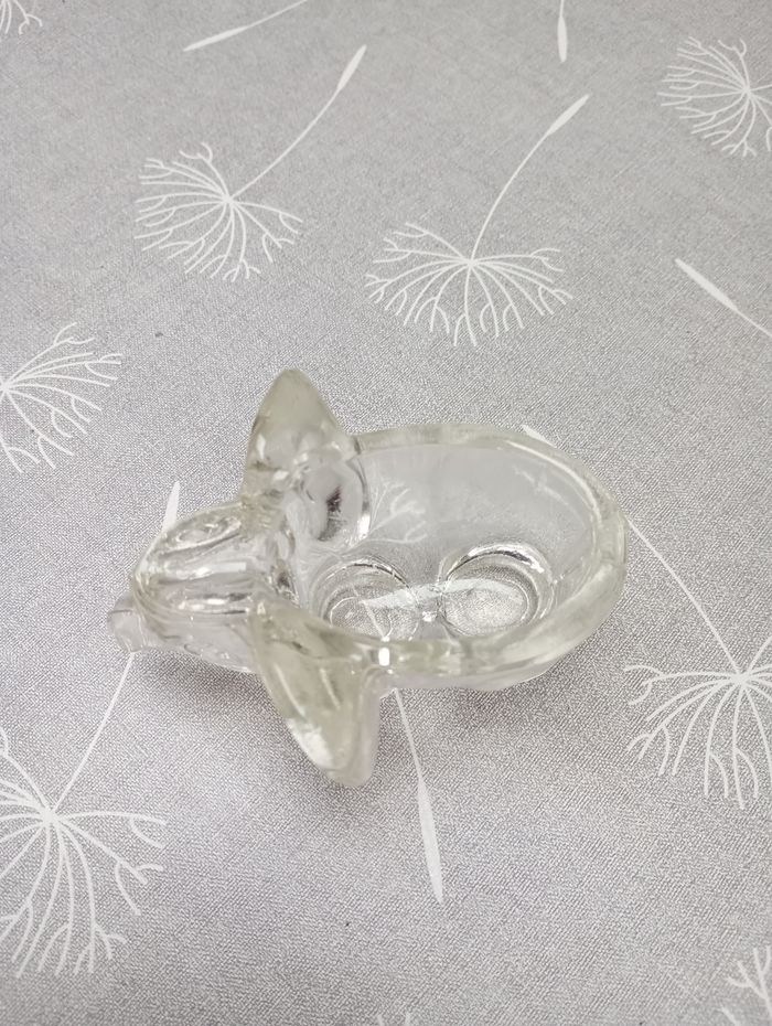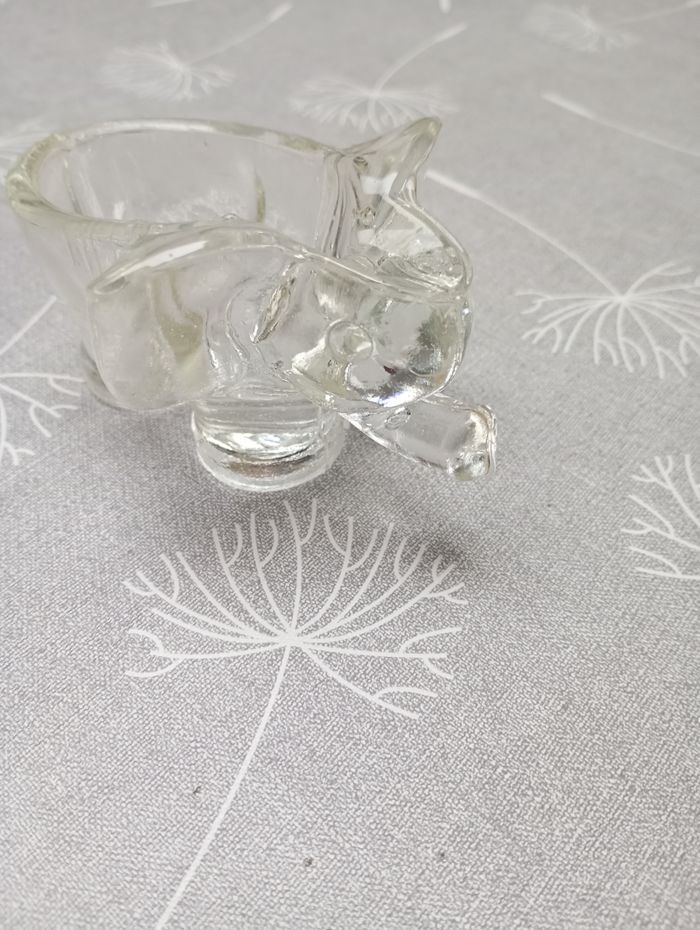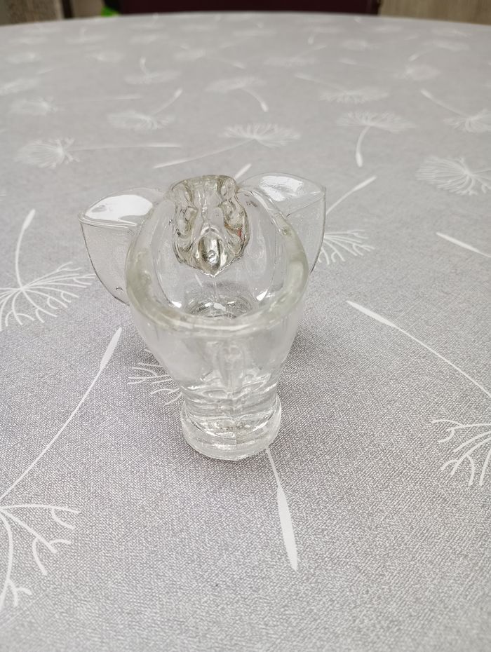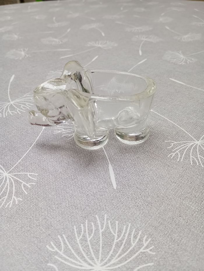Eléphant en verre. Peut être utilisé comme cendrier, vide-poche, bougeoir... 10 x 7 x 5,5 cm. Très bon état.