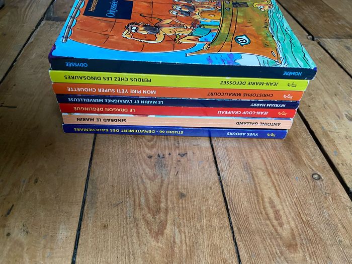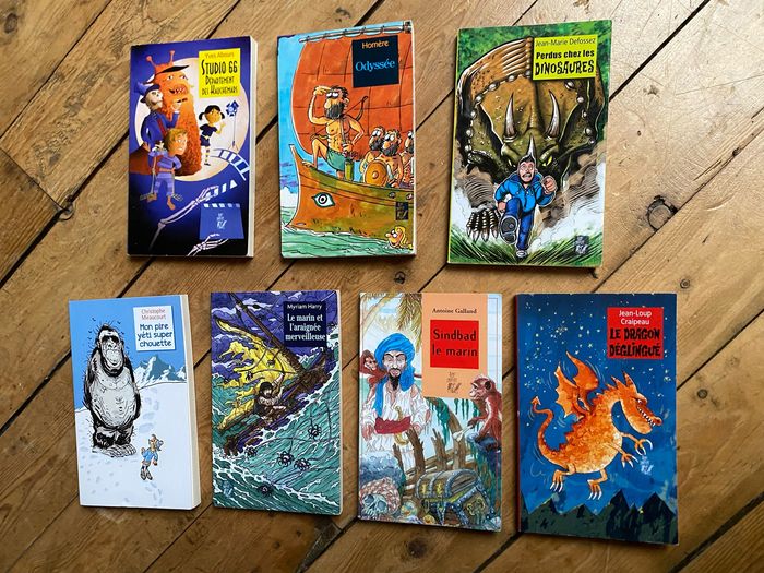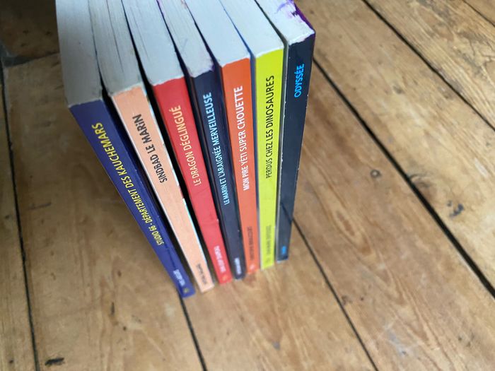 Lot de 7 livres « lire c’est partir «  4 Dès 9 ans en très bon état : Perdus chez les dinosaures Le dragon déglingué Mon pire yéti super chouette Studio GG département des Kauchemars 3 dès 10 ans en bon état : Sindbad le marin Le marin et l’araignée merveilleuse Odyssée