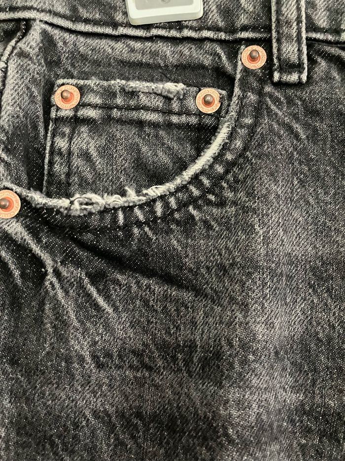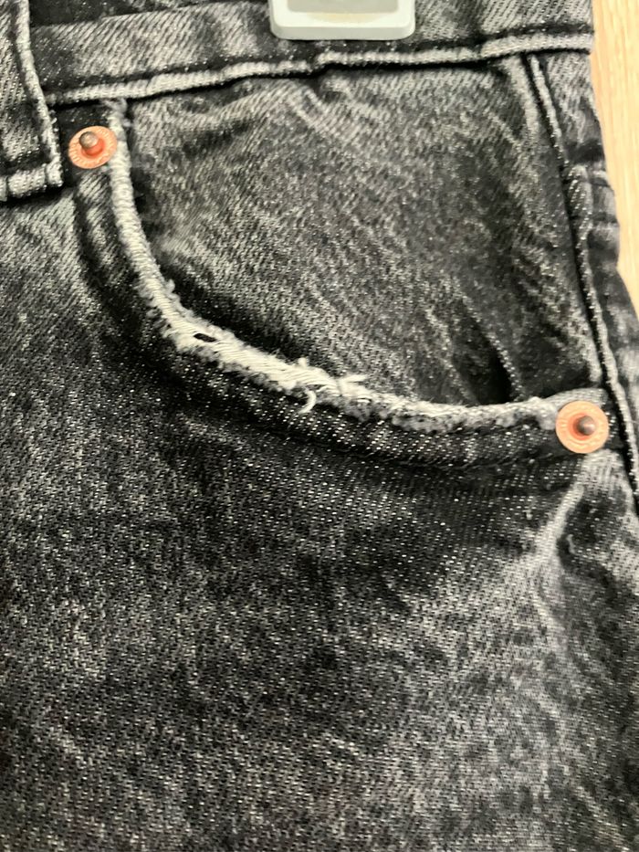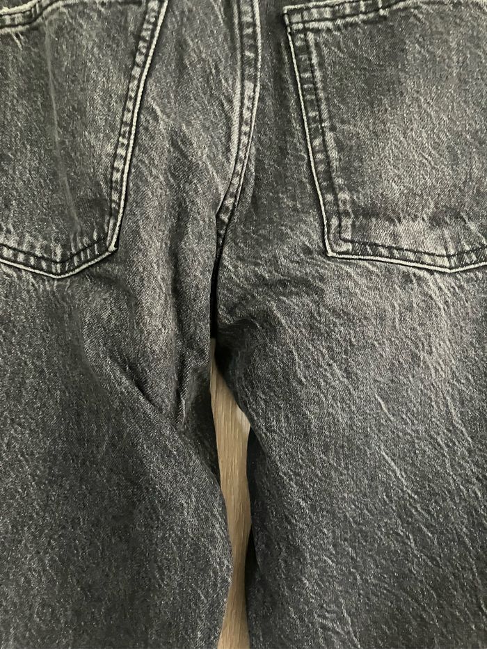 Jean noir coupe large délavé ZARA En très bon état : il a été très peu porté Composition : 100 % coton 2 poches avant +2 poches arrière Dimensions : - de la taille au bas : 110 cm - largeur de la jambe de l’entrejambe à la couture extérieure : 27 cm - largeur au bas de la jambe : 22 cm