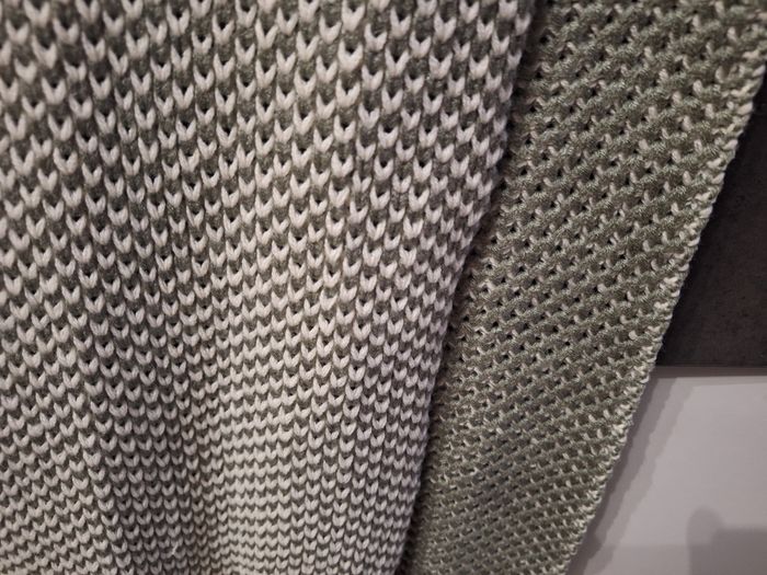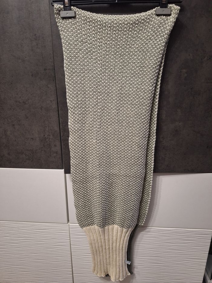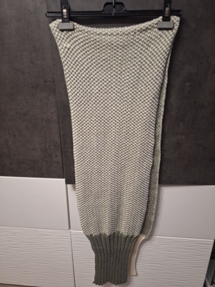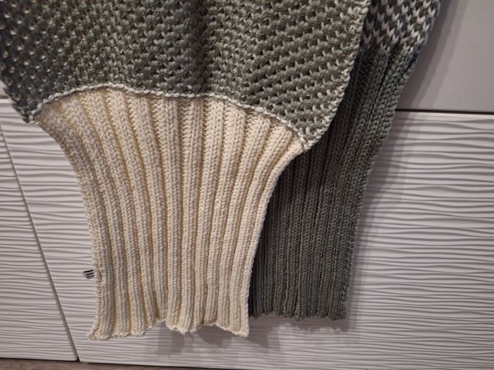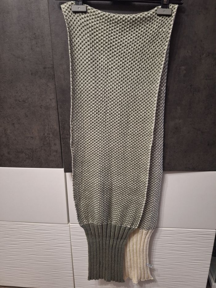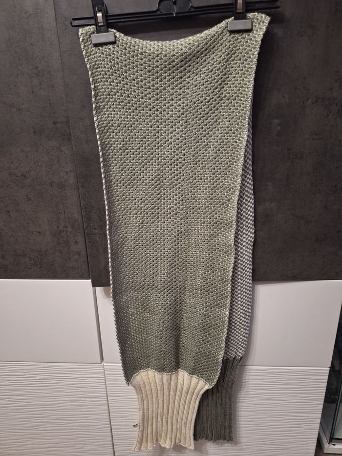 Jolie écharpe longue bi-ton écru vert foncé, grosses mailles, 2m06 x 29 cm de large, portée mais en très bon état