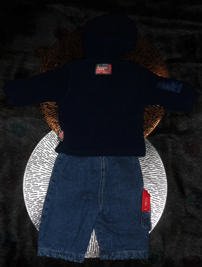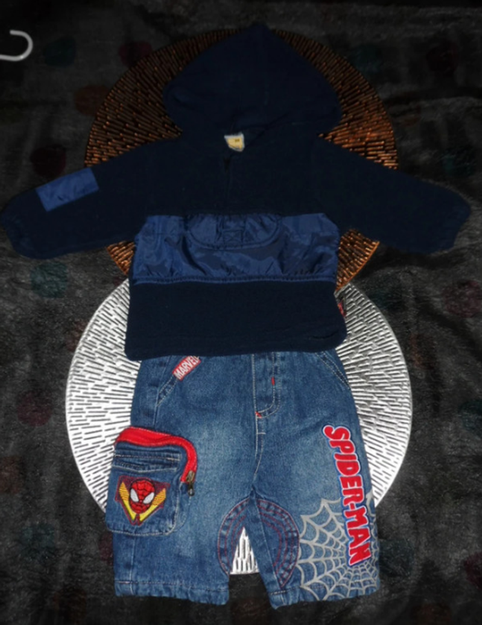 ensemble très chaud très bon état - taille 3 mois : * 1 pull polaire à capuche , poche ventrale "school wears" * 1 jeans doublé "Spiderman" quasi neuf