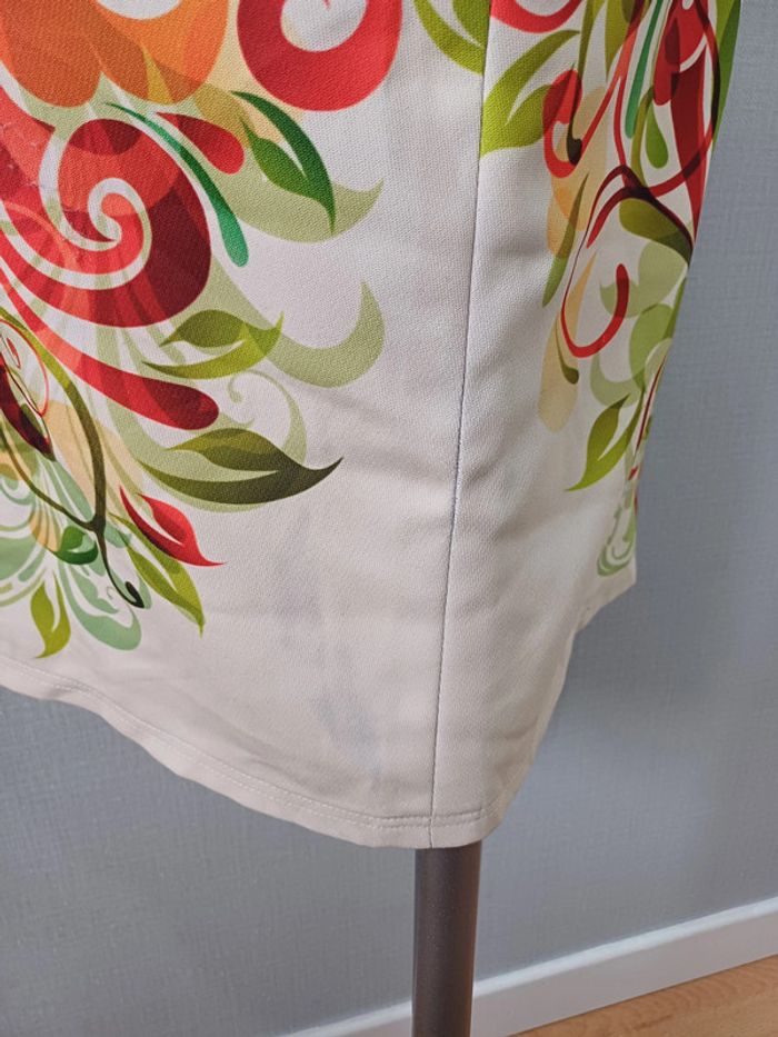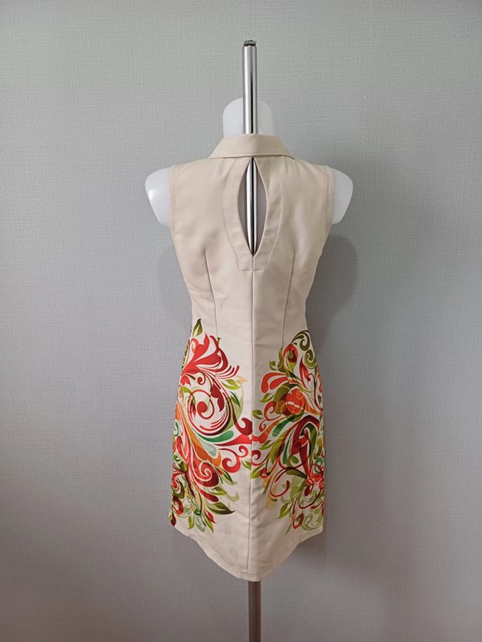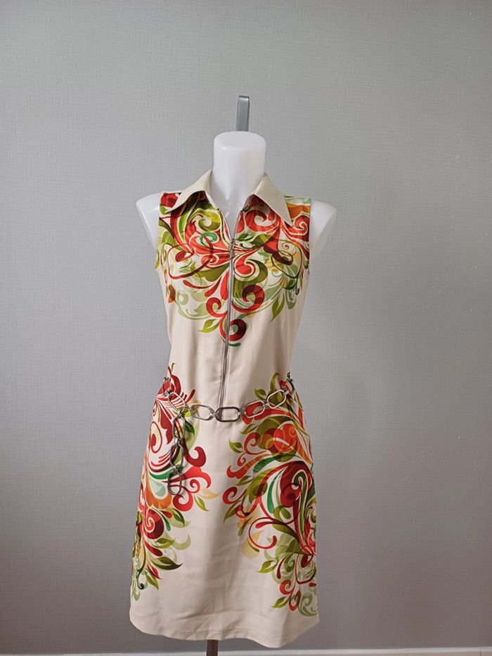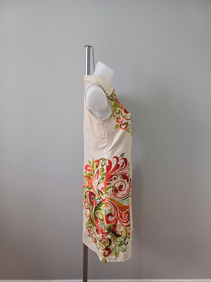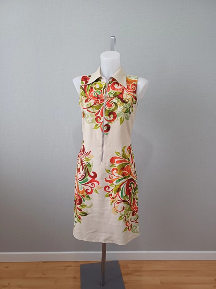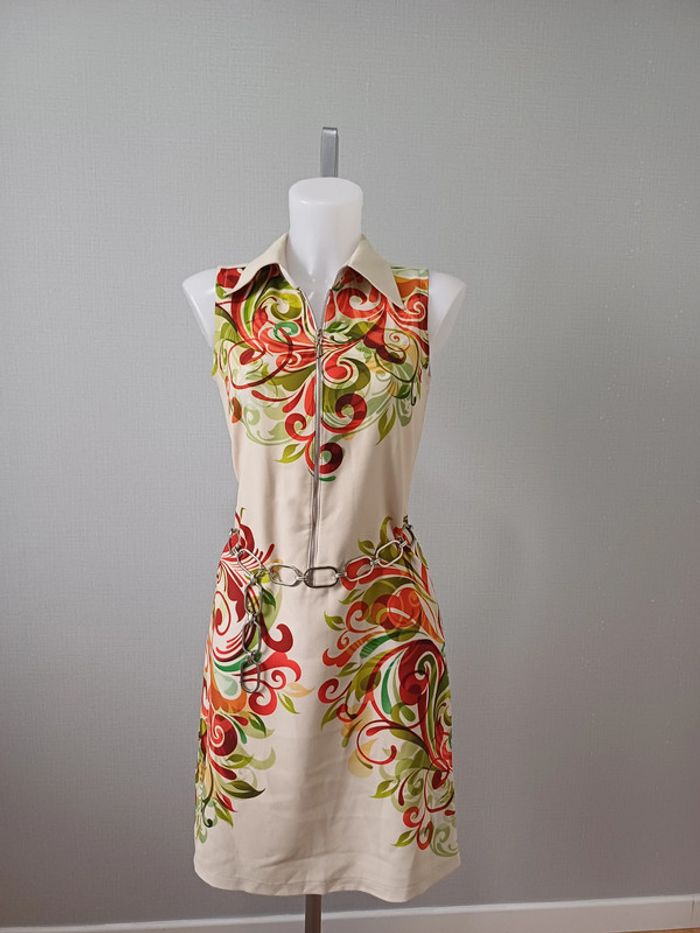 robe beige imprimé col chemise fermeture éclair sur le devant sans manches vendue sans ceinture Défaut à l'arrière de la robe dans le bas (trace plus foncé) voir dernière photo Taille 40 Matière 100% Polyester Epaules 33 Poitrine 42 Taille 40 Longueur 93