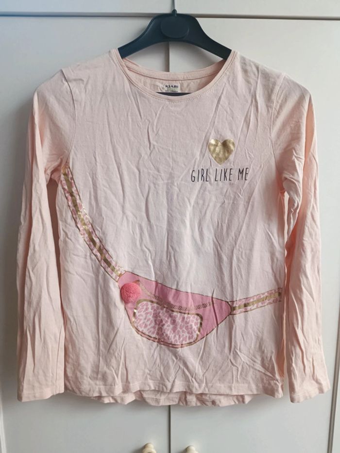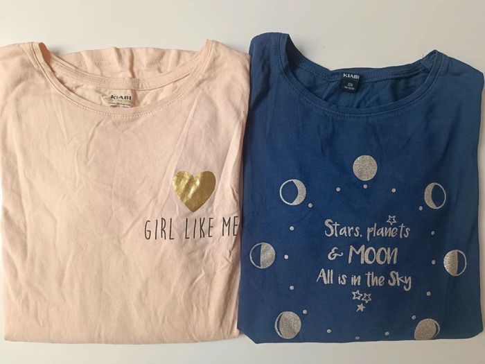 T-shirt Kiabi. Un rose saumon avec fausse banane et Pompon Un bleu marine. Peu porté. N'hésitez pas réductions sur les lots ☺️