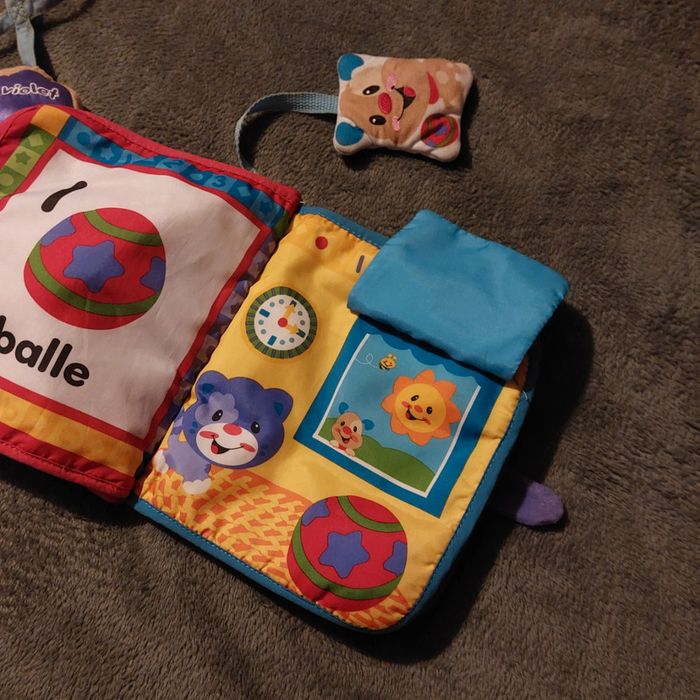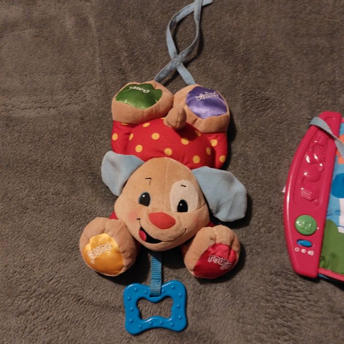 #jessicadebreujouetbebe Puppy le chien fisher price Un livre en tissu fait de la musique quand on appuie sur le bouton vert, le petit chien accroché fait hochet Un chien à accrocher fait de la musique quand on tire sur l'os Piles non fournit