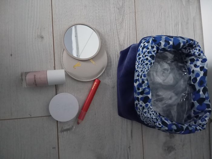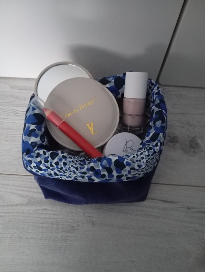 Coffret Cadeau maquillage idéal Noël Les produits sont neufs non entamés Miroir de poche et sa housse Blush Pur-e by Valérie Crayon lèvres rouge coquelicot Yolaine Vernis à ongles Théorie des Volcans Panière en tissus (autre coloris possible) #claireconcoursdivers