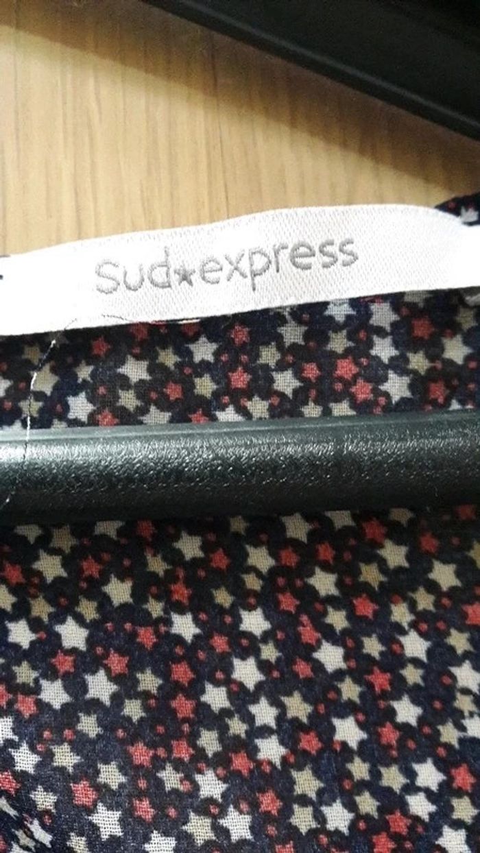 Blouse motif étoile, SUD EXPRESS, bleu marine avec etoile blanche beige et rouge, taille M, #angel43 (enlever les filtres)
