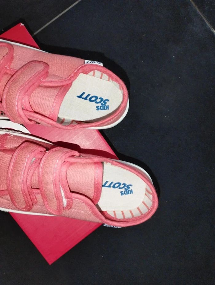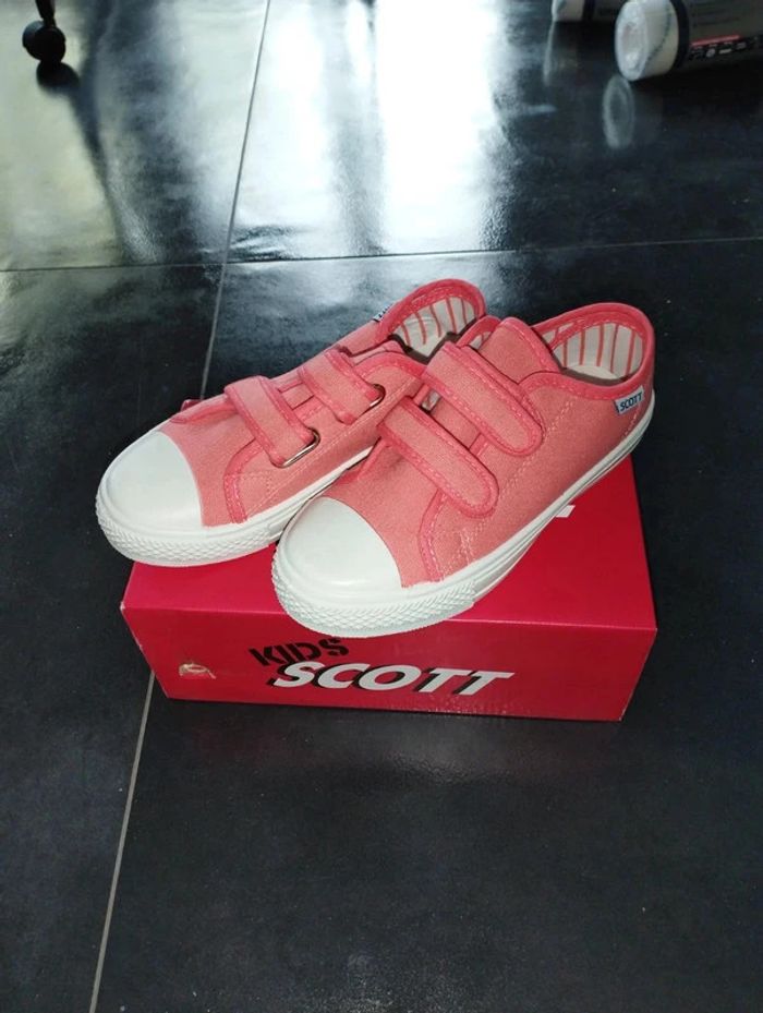 Je vend cette paire de baskets neuve jamais portée en tissus avec scratch couleur saumon. Marque kids Scott. Valeur 65 euro