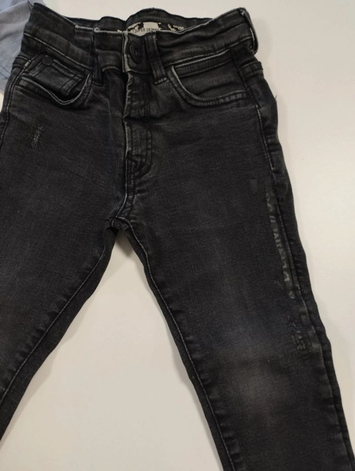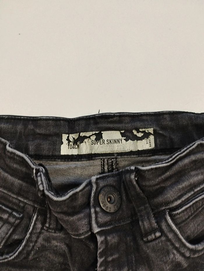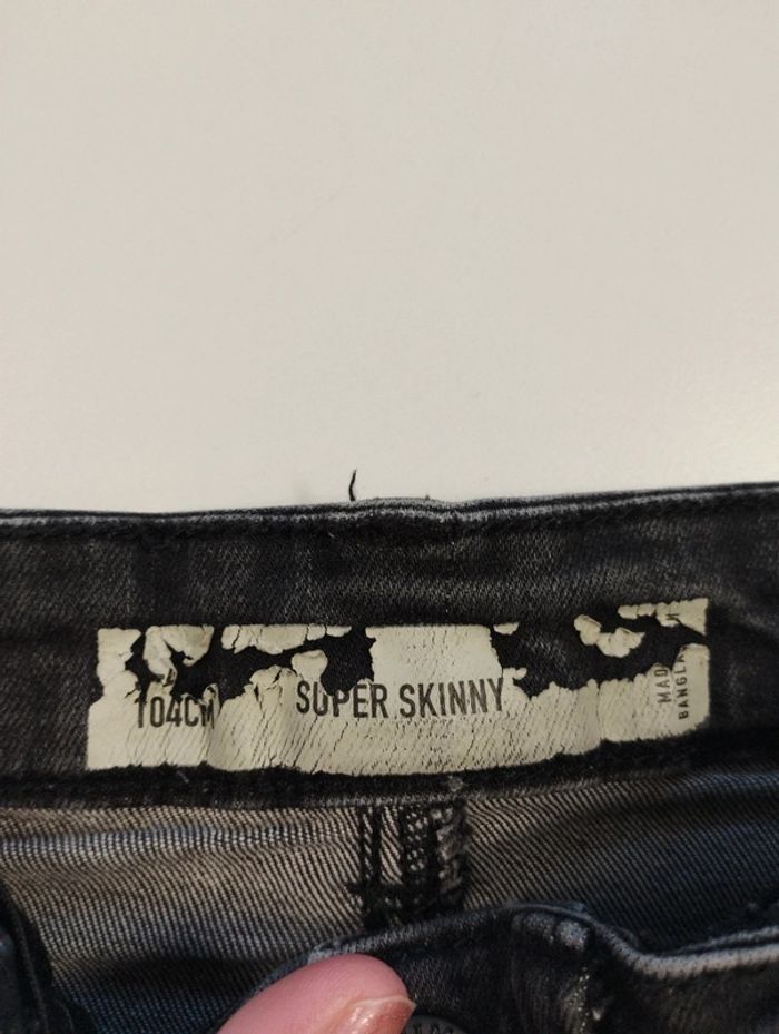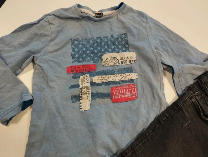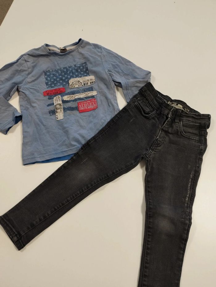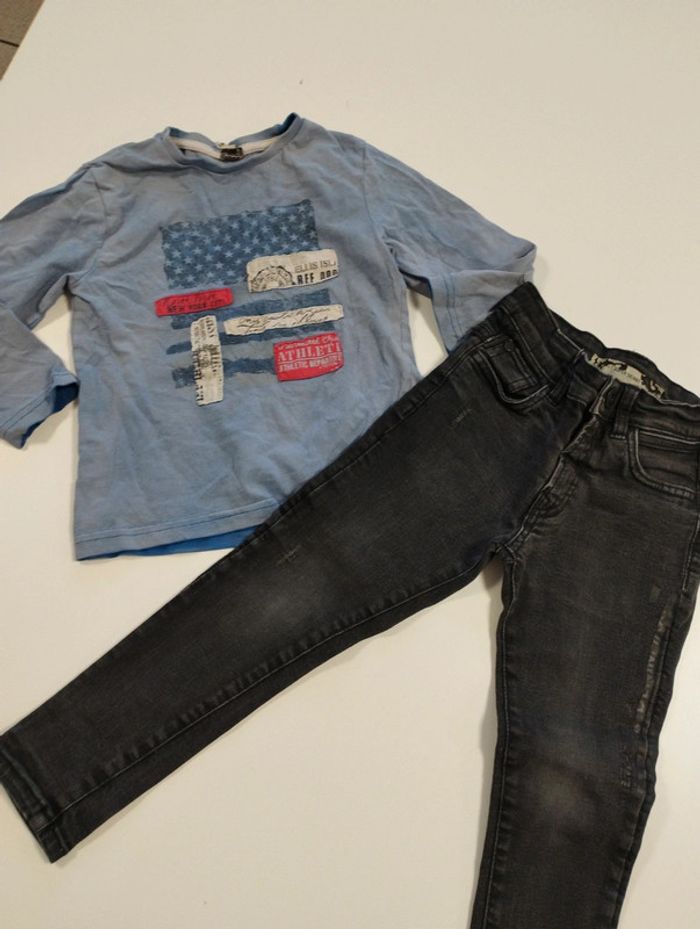 Jeans 104 cm coupe super skinny l étiquette est un peu effacé mais on voit la taille mais plus la marque. On voit l'écriture sur le côté du jeans un peu effacé. t shirt de la marque toa en 4 ans aussi. Regardez mes autres ventes pour regrouper l'envoi