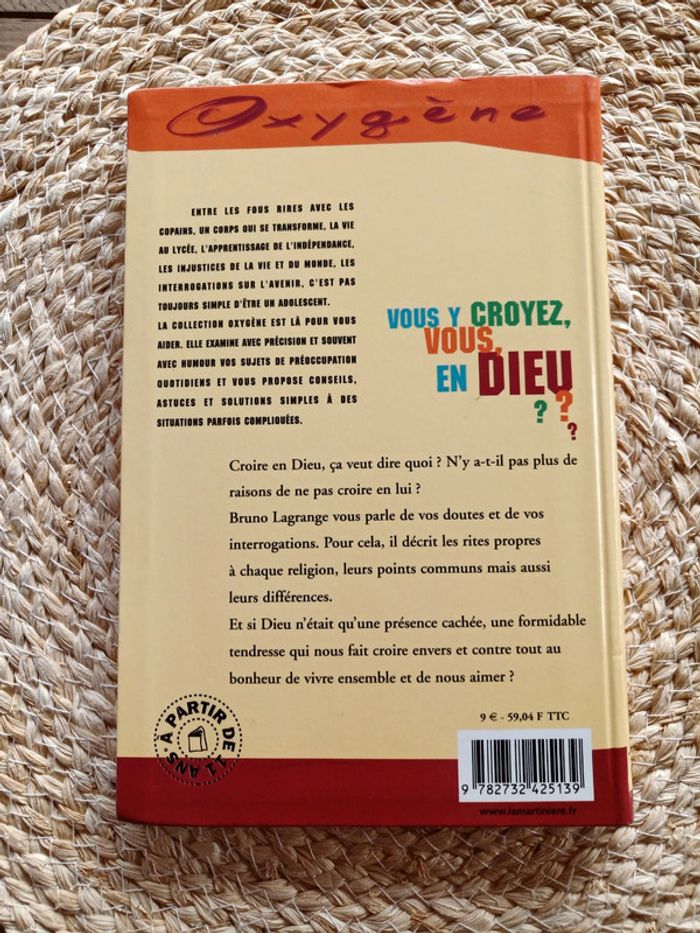 Livre : Vous y croyez, vous, en Dieu ??? Qui est Dieu ? A quoi ça sert de croire? Avec Rachid, Augustin et David partez à la découverte de Dieu... Bruno Lagrange Illustré par Philippe Kailhenn De La Martinière Jeunesse A partir de 11 ans En excellent état - proche du neuf ! Croire en Dieu, ça veut dire quoi? N'y a-t-il pas plus de raisons de ne pas croire en lui? Bruno Lagrange vous parle de vos doutes et de vos interrogations. Pour cela, il décrit les rites propres à chaque religion, leurs points communs mais aussi leurs différences.