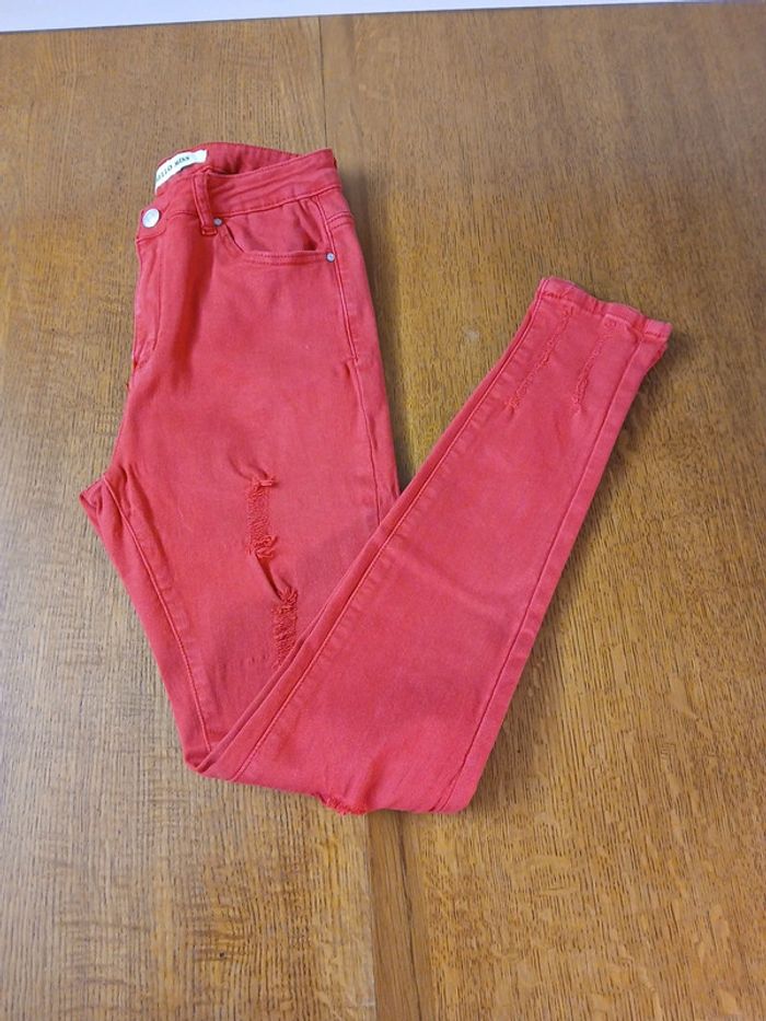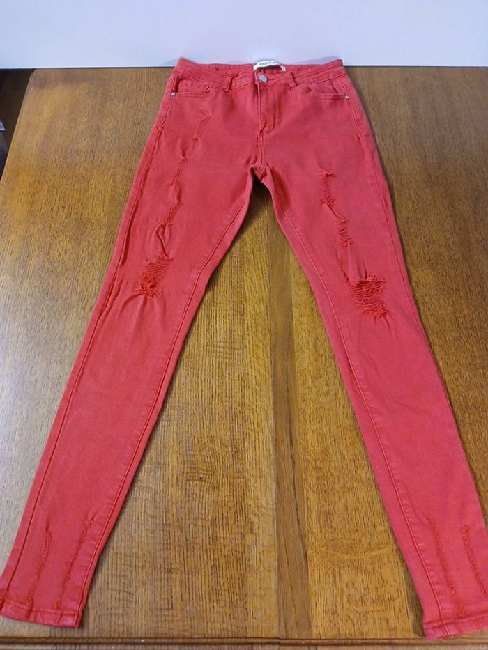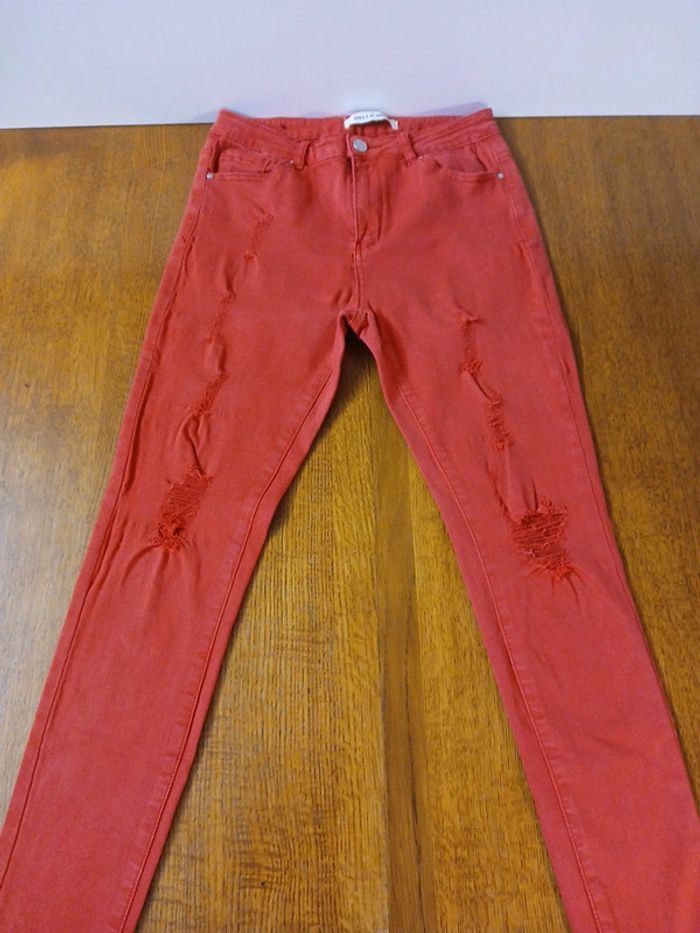 Jean troué skinny Marque hello miss Sur étiquette, la taille indiqué est 40 mais taille petit et correspond à un 38 Dimensions Taille à plat 36 cm Longueur jambes 96 cm Taille haute Couleur rouge