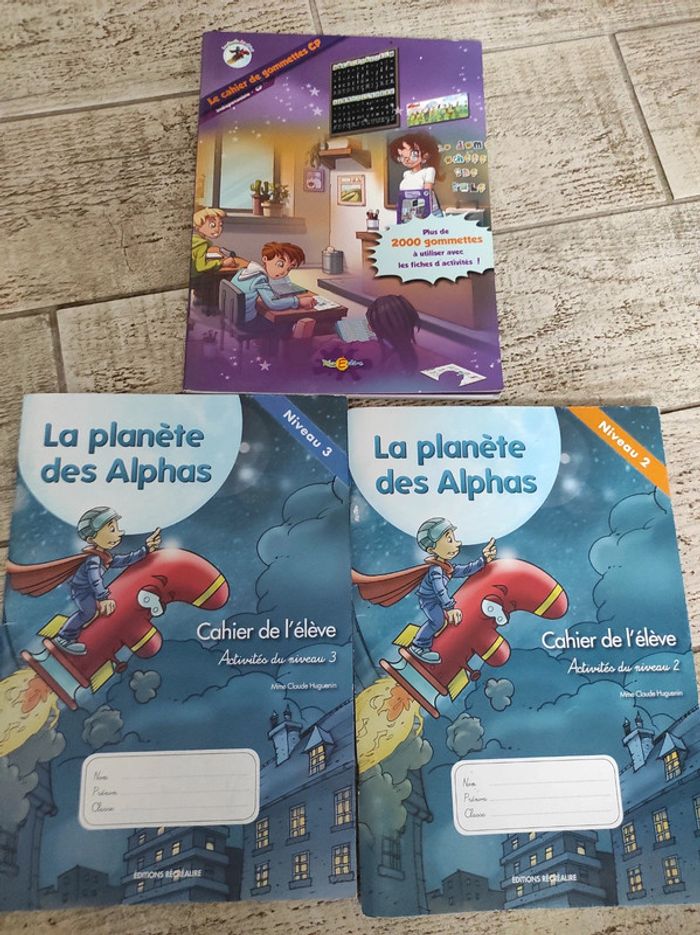 Lot de cahiers d'activités la planète des Alphas. En très bon état : à peine 2 pages écrites dans les cahiers d'activités. Manque la première planche de gommettes (chapitre 1) et le tout début du chapitre 2 dans le cahier de gommettes. Voir photos