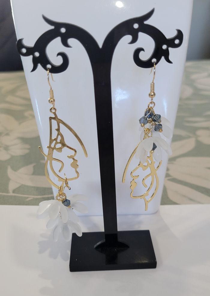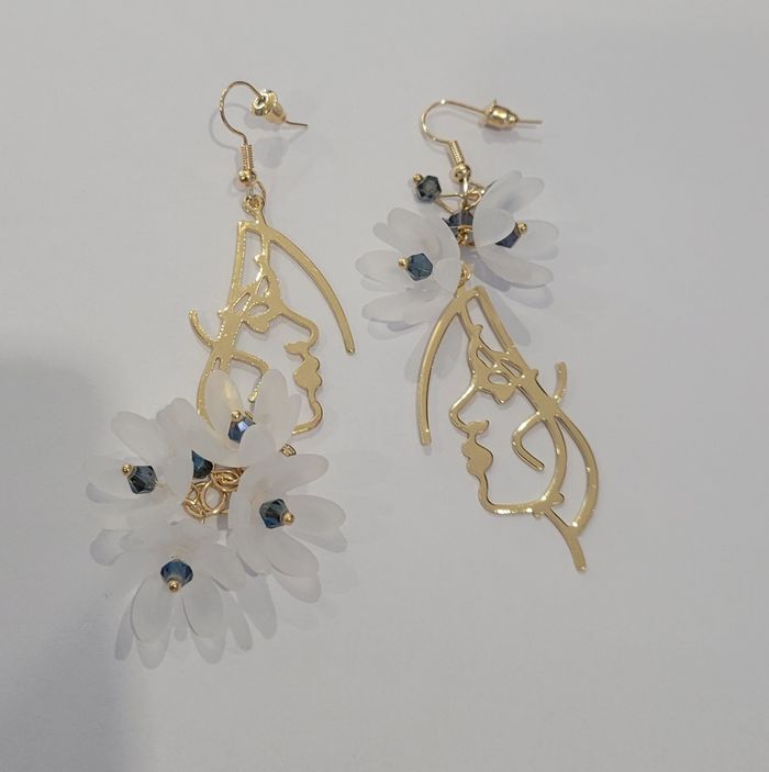 BOUCLES D'OREILLES ASYMETRIQUE VISAGE FEMME ET FLEURS ! NEUF! - photo numéro 4