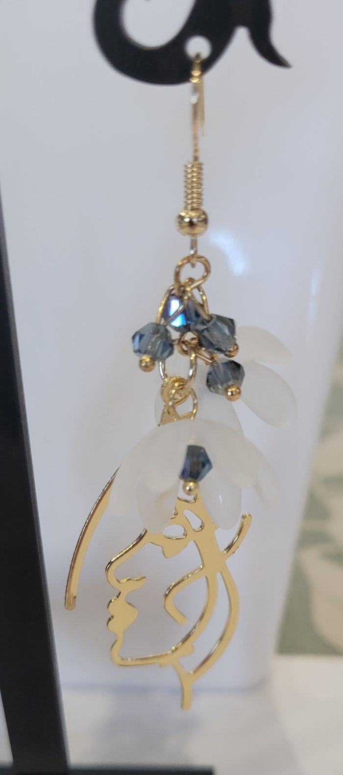 BOUCLES D'OREILLES ASYMETRIQUE VISAGE FEMME ET FLEURS ! NEUF! 1 jolie paire de boucles d'oreilles motif visage de femme. Coloris doré, fleurs blanches et perles bleues. BOUCLES D'OREILLES ASYMETRIQUE. Hauteur totale : 8,8 cms pour la plus longue et 8 cms pour la plus courte . N'hésitez pas à regarder mes autres ventes. ( beaucoup d'autres modeles sont disponible) .Envoi rapide et soigné.