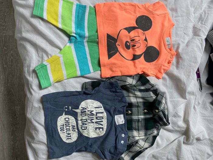 Vend lots de vêtements taille 1 mois 2 t shirt manche courte de marque disney l autre sans marque 1 chemise manche longue marque Kiabi 1 pantalon multicolore marqué Kimadi Tous en très bon état
