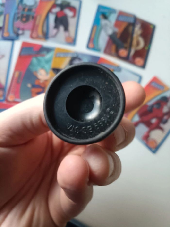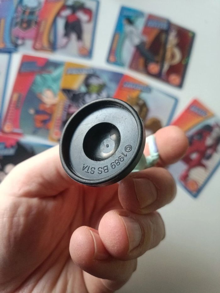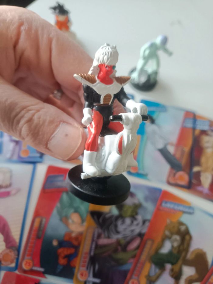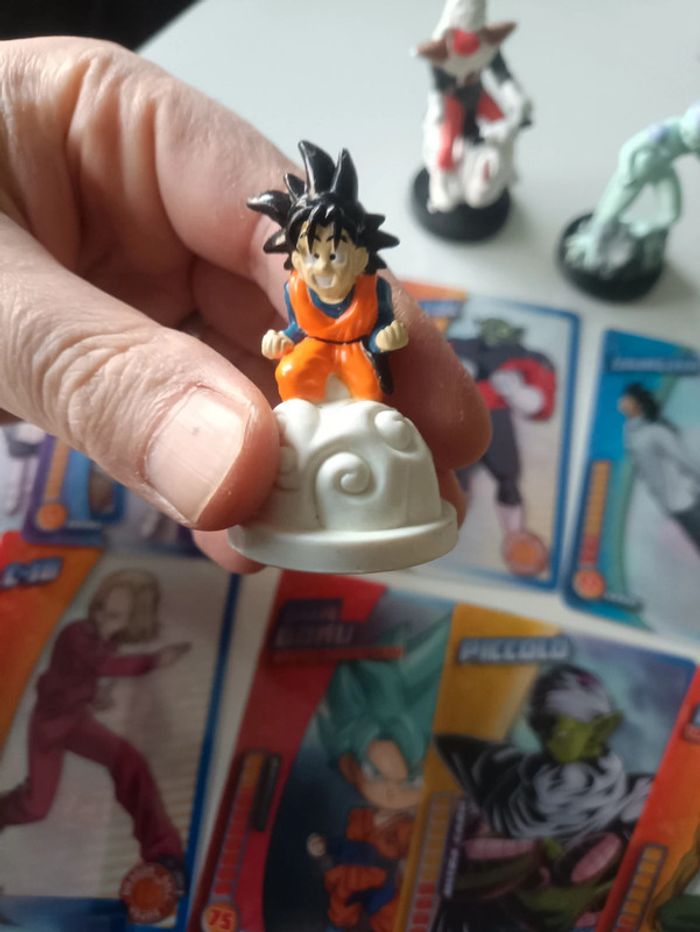 Petit lot dragon ball composé de trois figurines vintage issues d'un jeu d'échecs et de 15 cartes panini dragon ball super.