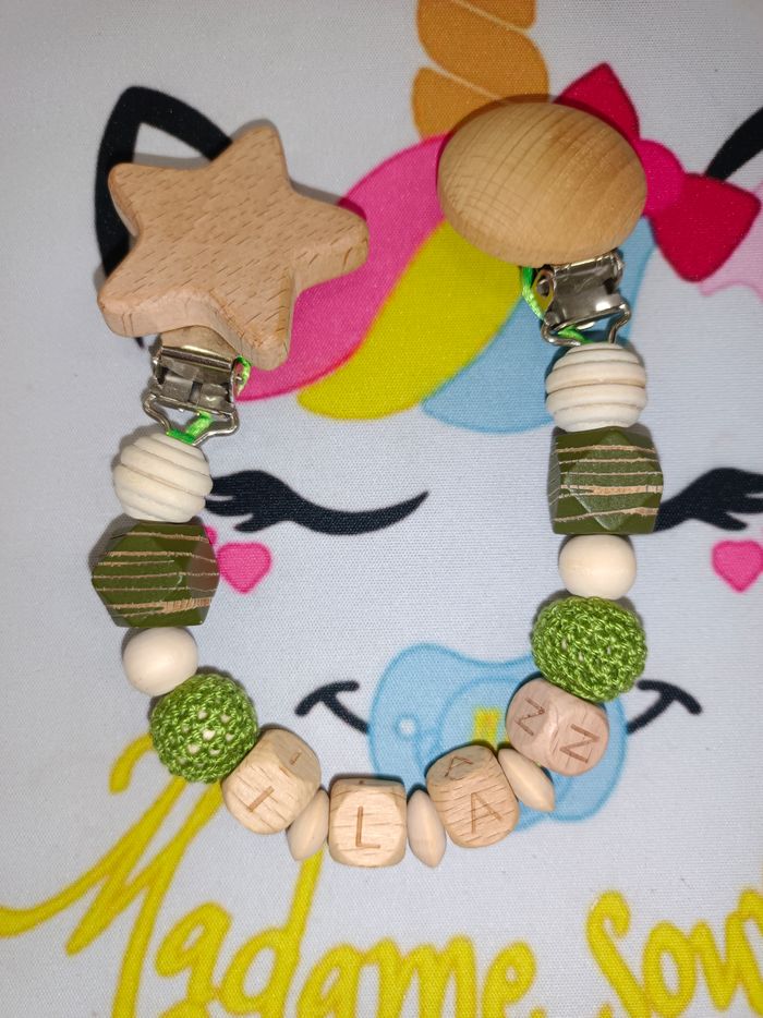Une Attache doudou Bois pour ne plus perdre le doudou avec deux clips pour accrocher aux tissus sans les abîmer, un pour le vêtement, l'autre au doudou. Respect des normes CE, composée de perles silicone alimentaire et/ou bois naturel. 100% personnalisable, énormément de choix de clips, perles, etc… Envoyez-moi un message afin de créer main dans la main votre accessoire idéal. Une photo du prototype de celui-ci vous est envoyé pour validation avant envoi.