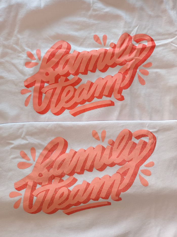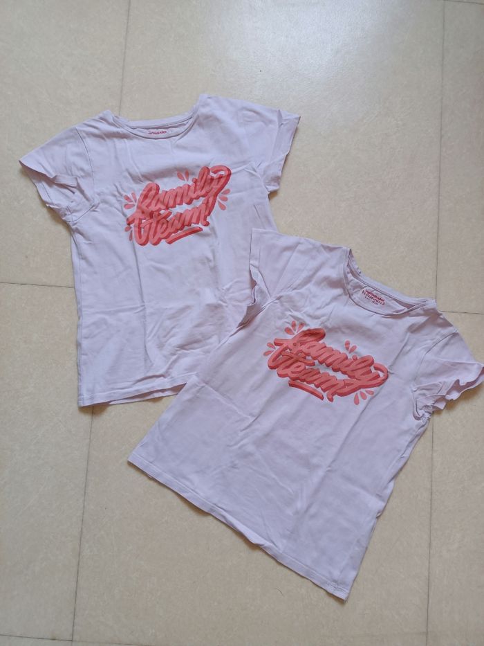 2 t-shirt pour jumelles roses 'family team'. Un à 2 petites tâches dans le bas visibles en photo. En coton bio. 8ans, Vertbaudet. G130